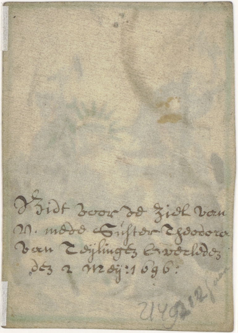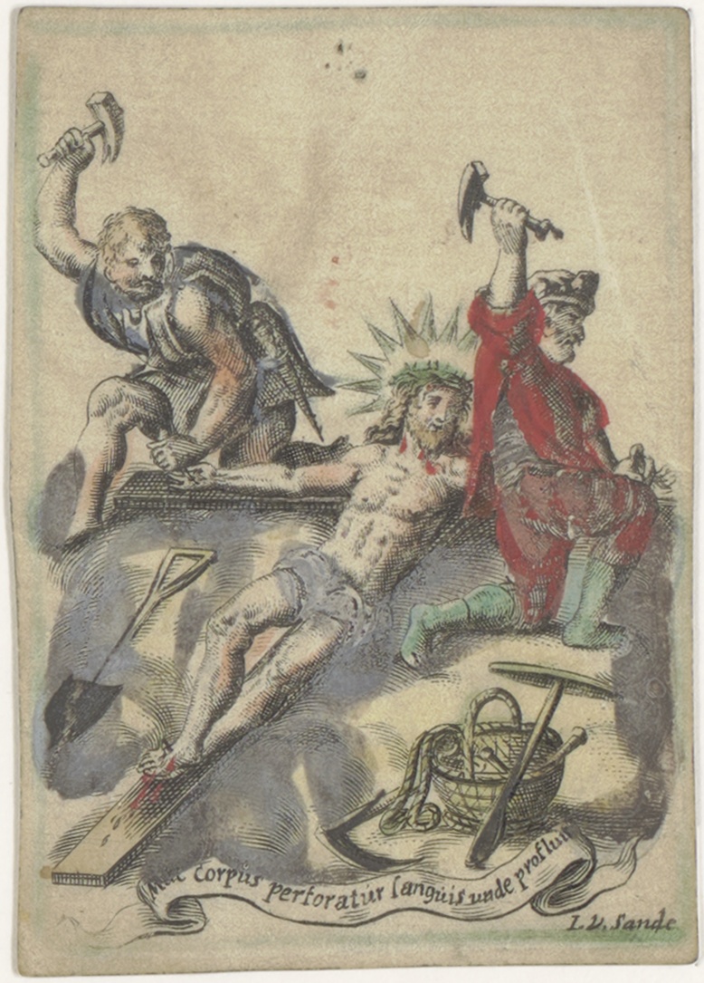Christus wordt aan het kruis genageld, ingekleurd, kz. religieus;bid voor ziel mede suster Theodora van Teijllingen (+1696)