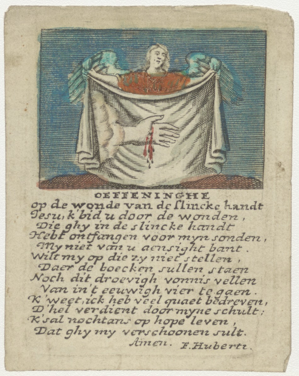 Engel met Veronicadoek met bloedende wond, met gebed, ingekleurd