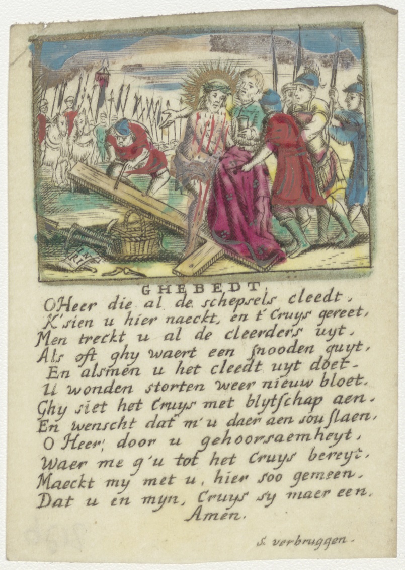 Christus wordt van zijn kleren ontdaan, met gebed, ingekleurd