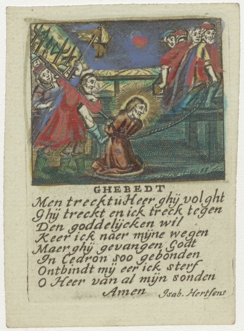 Christus gevangen genomen en meegesleurd, ingekleurd, met "Ghebedt Men treckt u Heer ghij volght Ghij treckt en ick treck tegen ..."