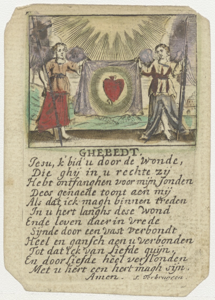 Twee engelen met Veronicadoek met hart van Christus, met gebed, ingekleurd, kz. gebed;de Jong