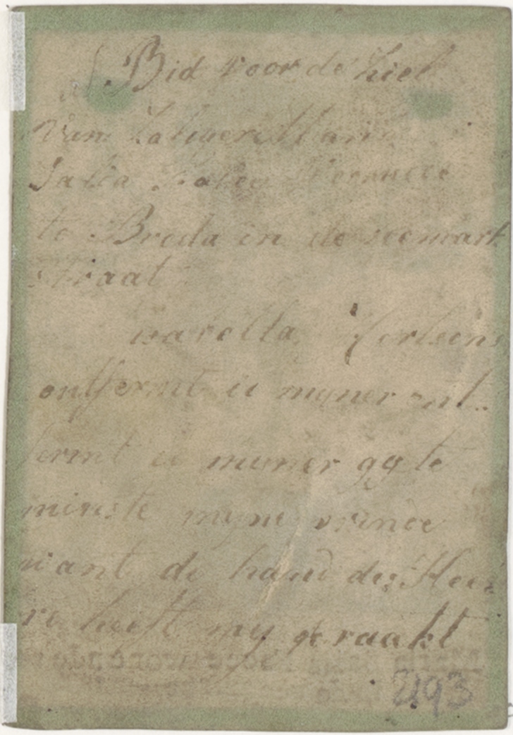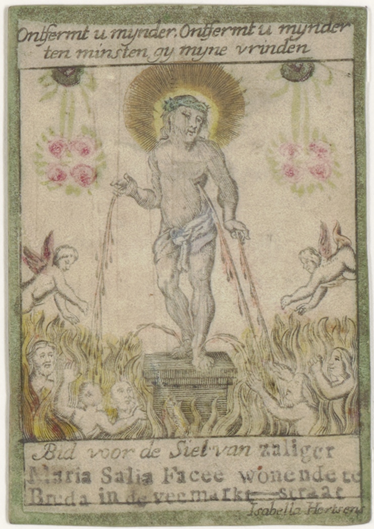 Christus bloed stroomt in de hel, ingekleurd, kz. bid voor ziel Maria Salia Facee wonende in Veemarktstraat in Breda (tekst ook gedrukt op voorkant)