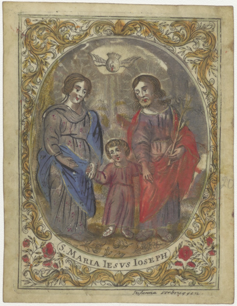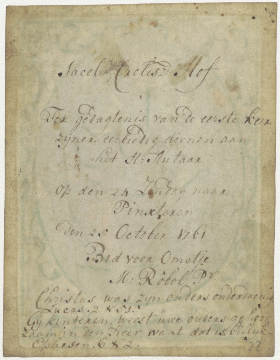 H. Familie met duif, ingekleurd, kz. Gedachtenis 1e keer dienen H. Altaar;1761;Hof door Rôbol (pr.)