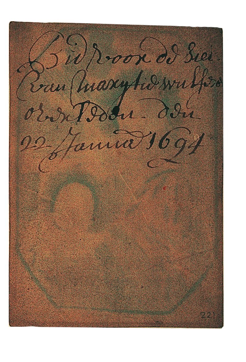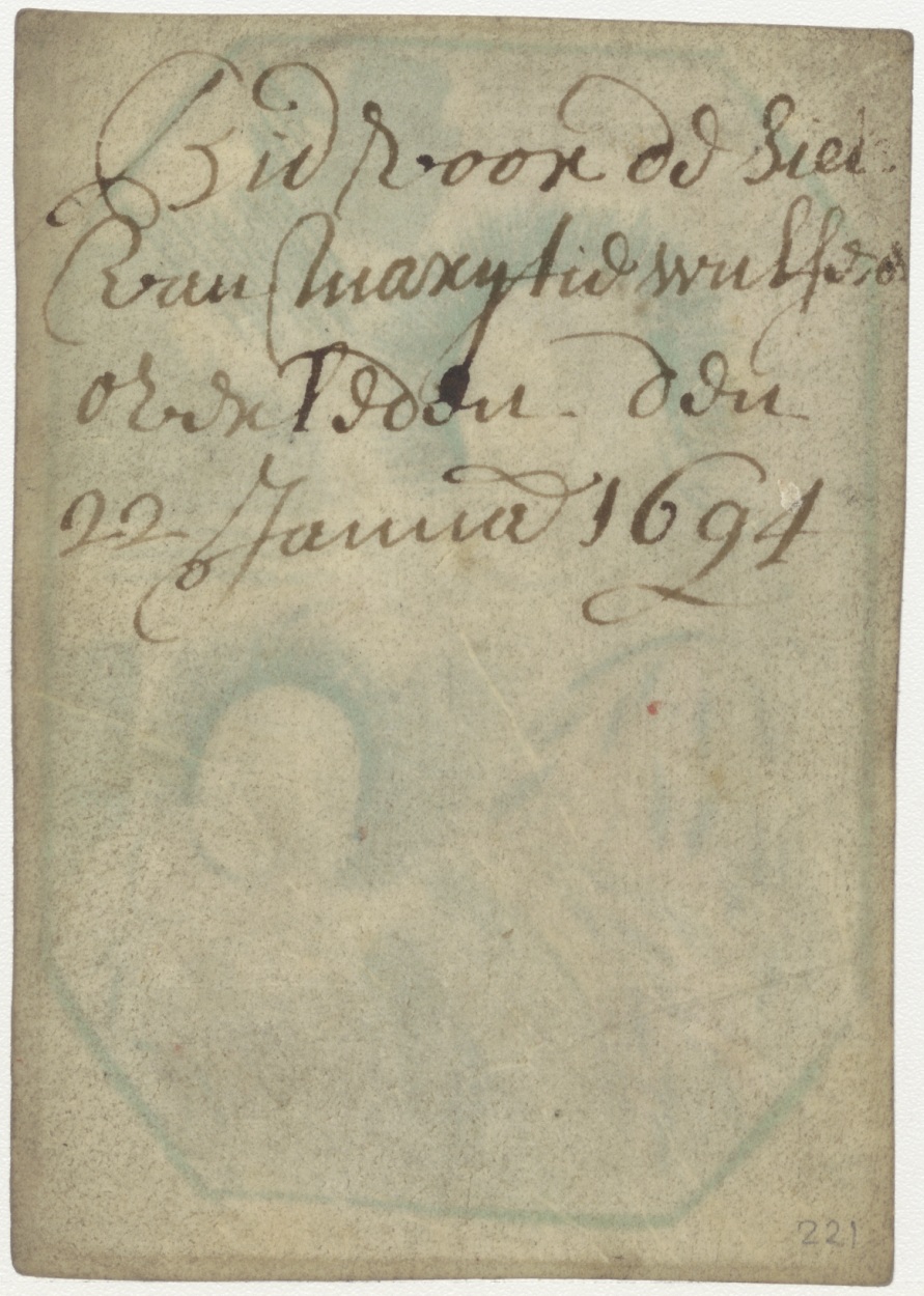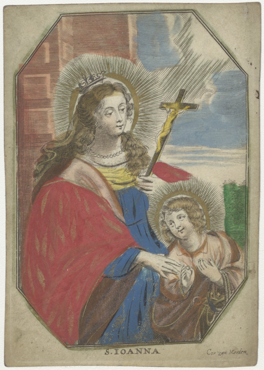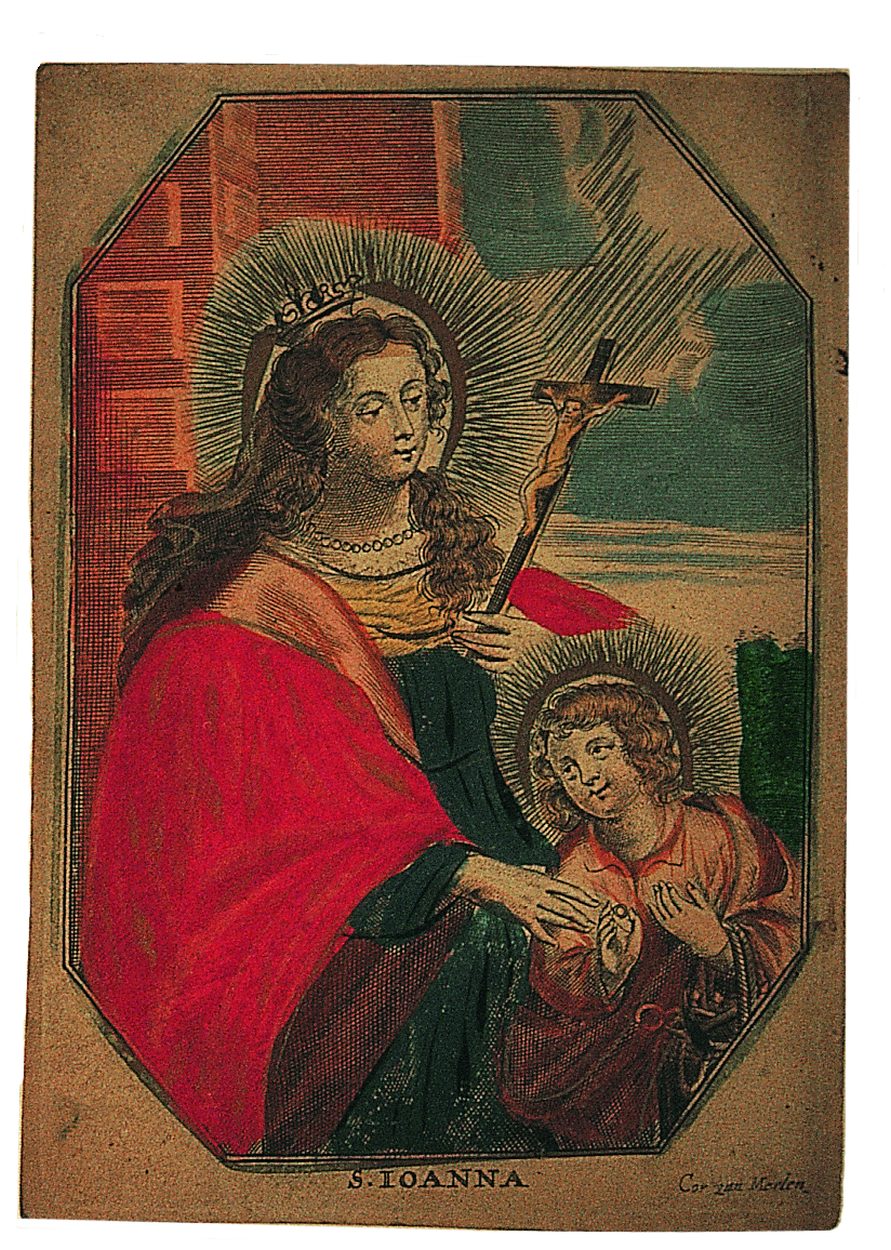 H. Joanna (H. Johanna van Valois), met Christuskind, ingekleurd, kz. Bid voor ziel Marijtje Wulfers (+1694)