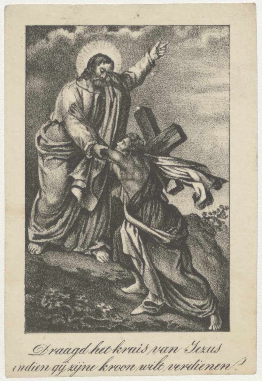 Draagt het kruis van Jezus... man met kruis wordt door Christus de weg gewezen