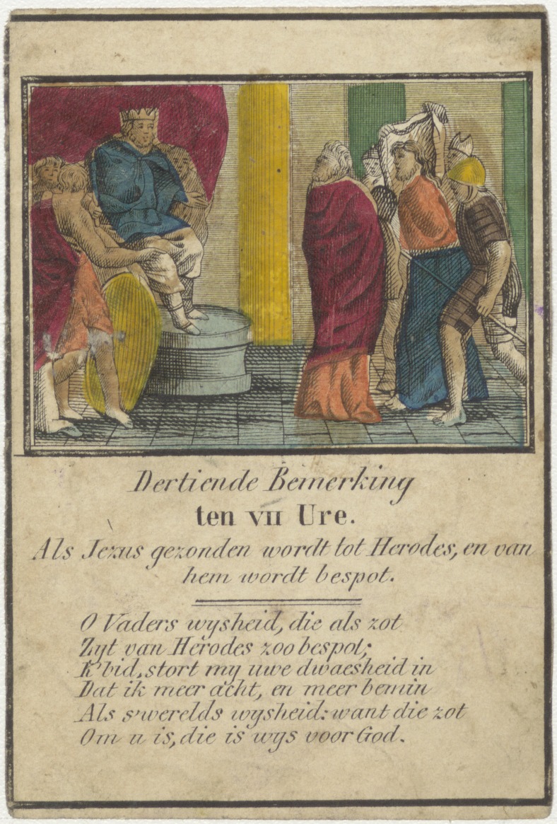 Passieserie (13); Christus voor Herodus, met gebed, ingekleurd