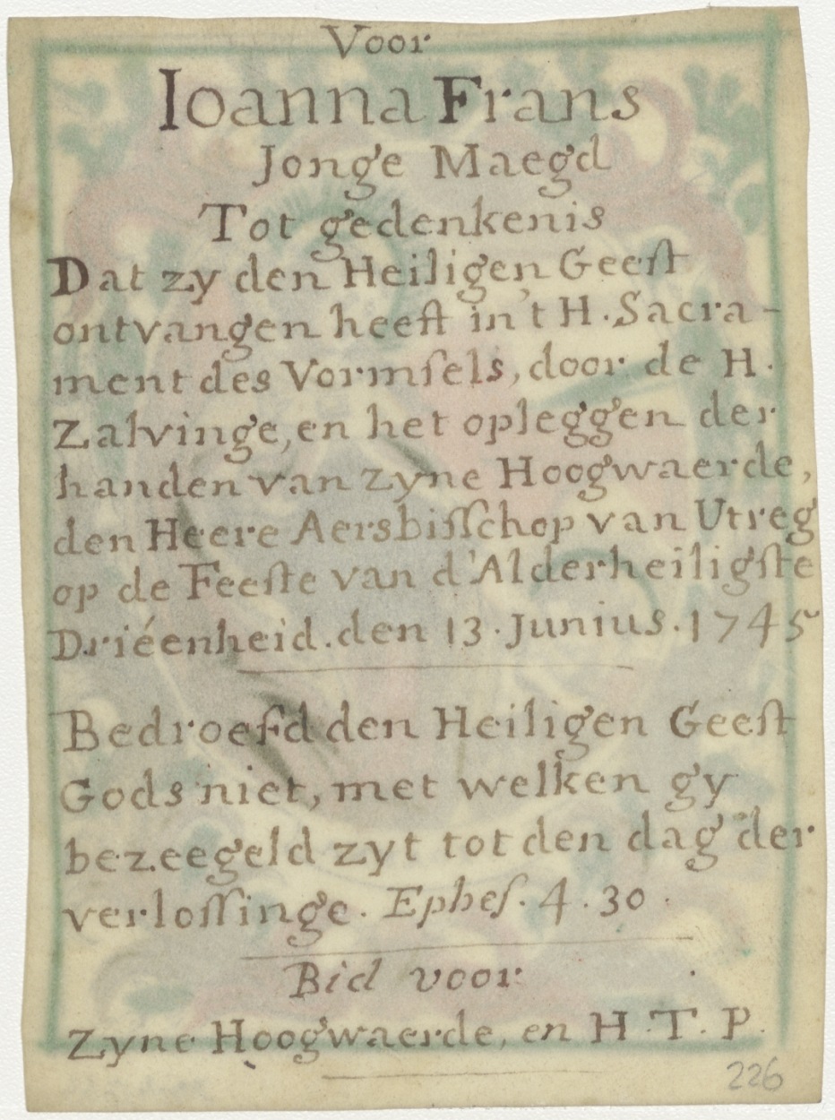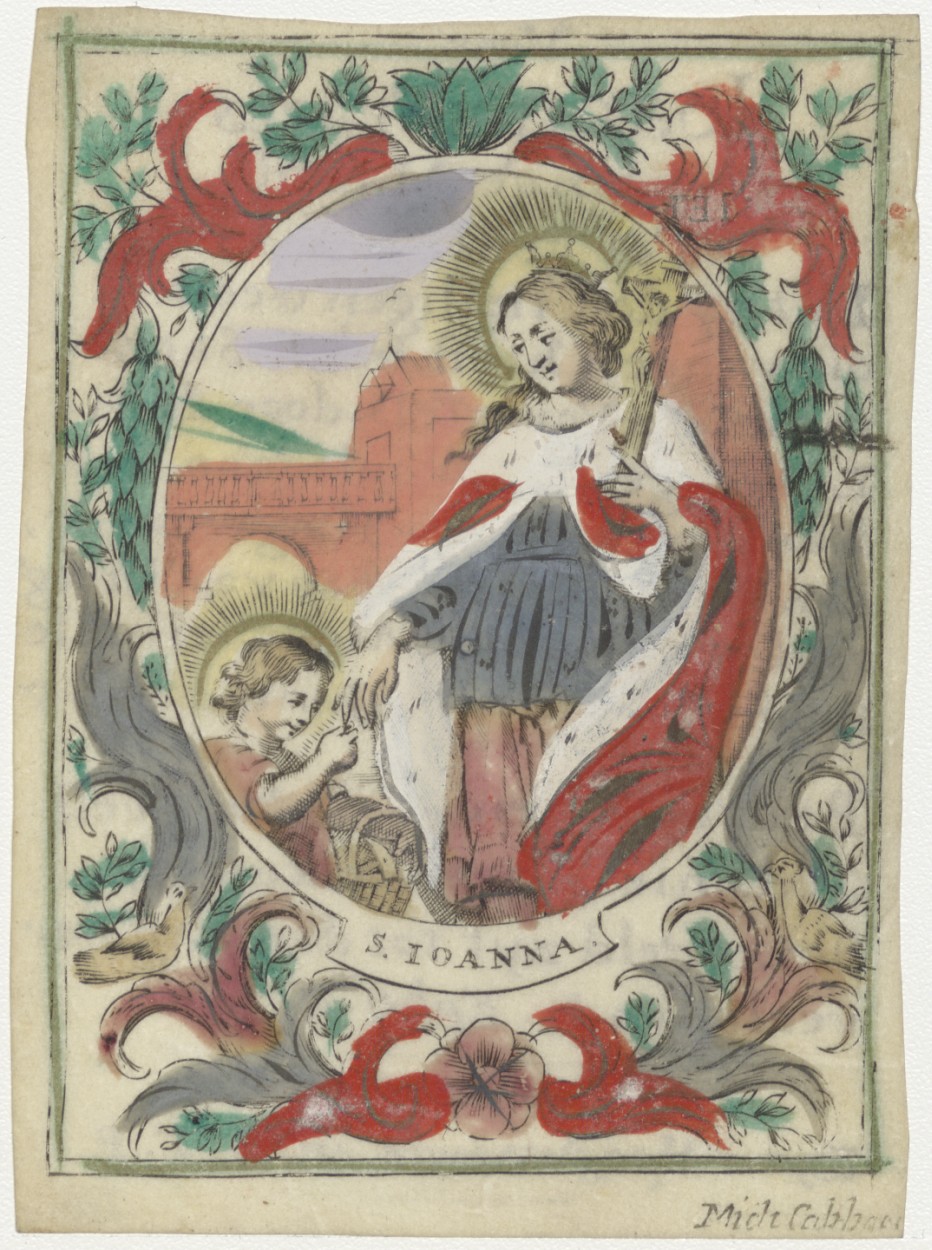 H. Joanna (H. Johanna van Valois), met Christuskind, ingekleurd, kz. religieus; vormsel maegd Joanna Frans, 1745, door aartsbisschop van Utrecht, bijbeltekst, bid voor H.T.P.