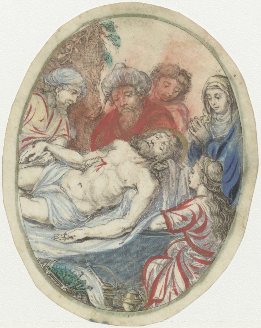 Graflegging van Christus, ingekleurd, kz. tekst, oud schrift(?)