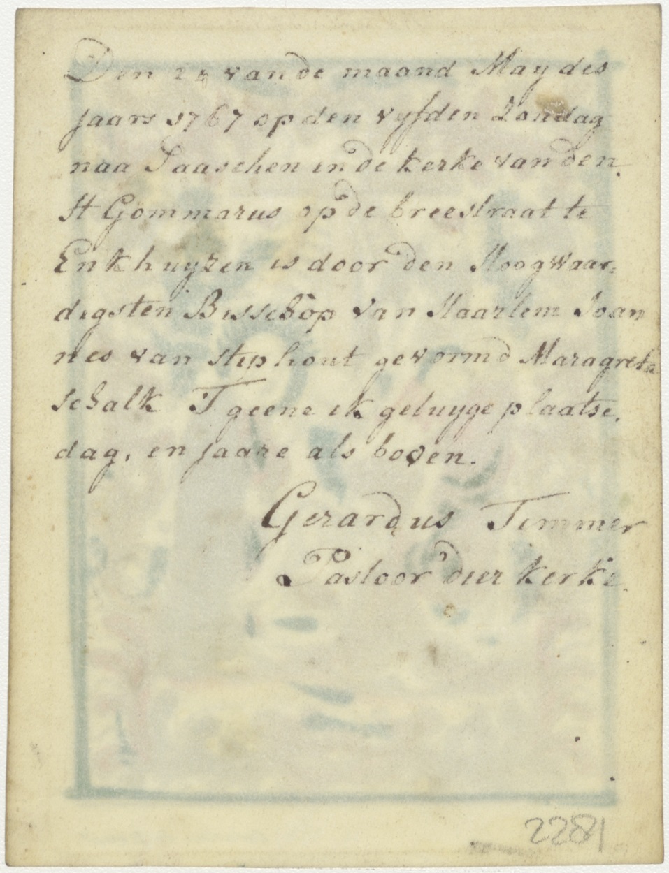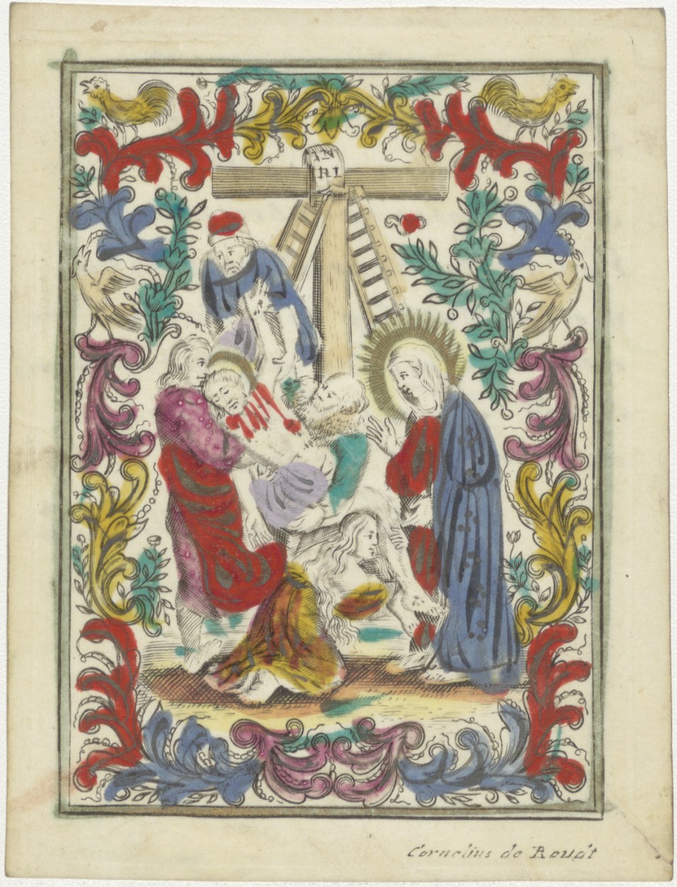 Kruisafneming van Christus, ingekleurd, kz. H. Vormsel Margareta Schalk (1767) door bisschop Joannes van Stiphout in kerk H. Gommarus, Enkhuizen, bij pastoor Gerardus Timmer