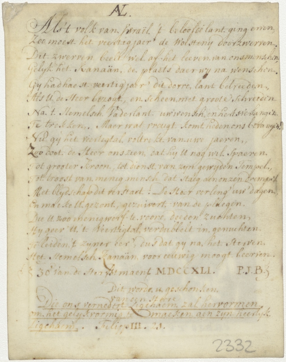 Verrijzenis Christus, kz. gecalligrafeerd gebed van P.J.B.;1741
