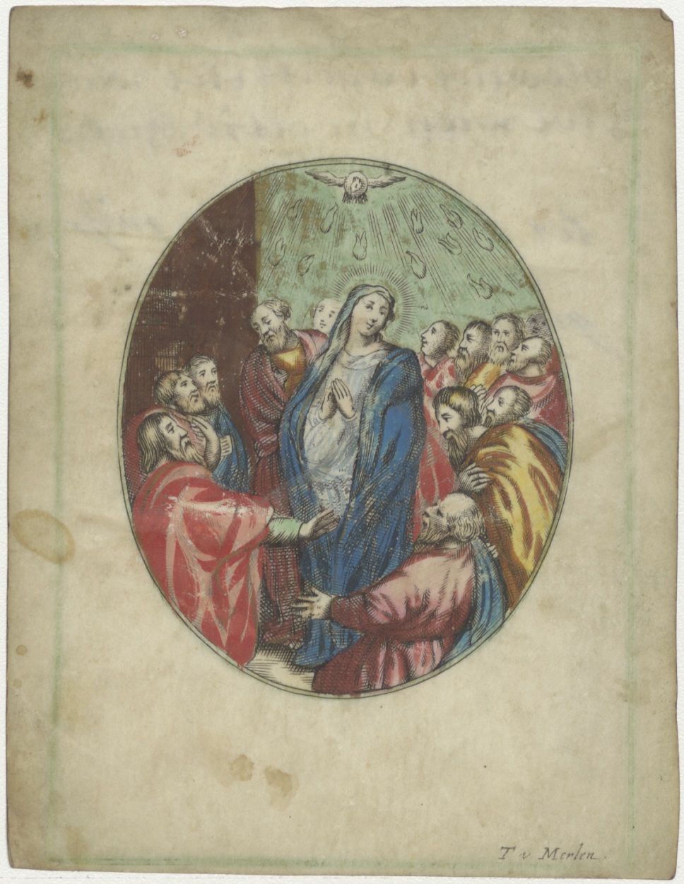 Pinksteren, ingekleurd, kz. religieus(?);oud schrift ... bid voor ziel Neeltje Jans, dubbelgebruik: ter gedachtenis van mijn grootmoeder 1881