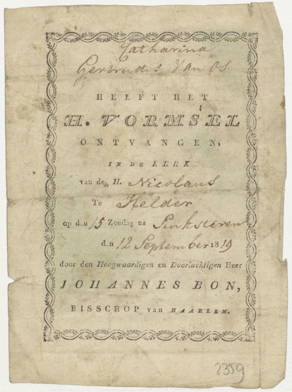 Pinksteren (Frans), ingekleurd, kz. H. Vormsel Catharina Gertrudis van Os (1819) door Joh. Bon bisschop van Haarlem (Den Helder)