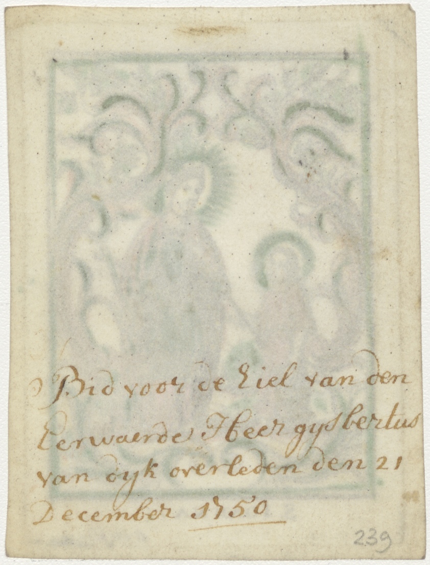 S. Joanna (H. Johanna van Valois), met Christuskind, ingekleurd, kz. Religieus;Bid voor ziel Gijsbertus van Dijk (+1750), priester