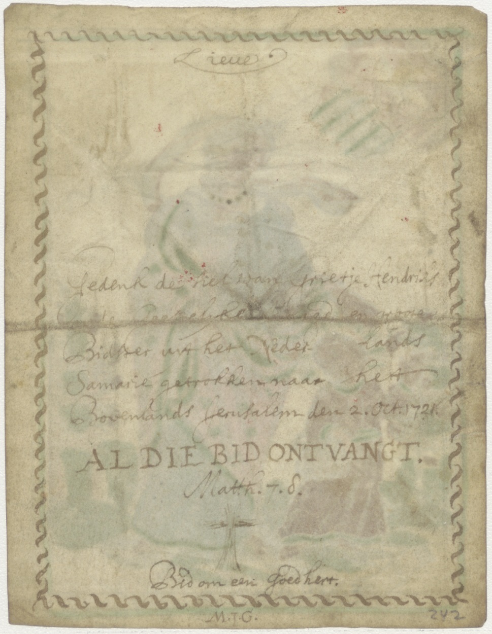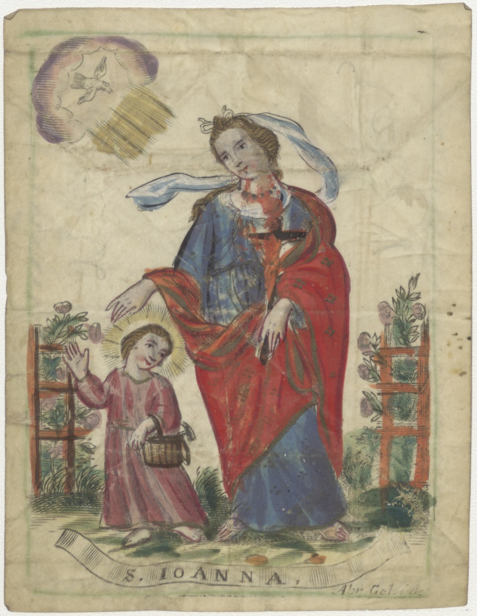 S. Joanna (H. Johanna van Valois), ingekleurd, kz. Gedenk de ziel van Grietje Hendriks, ... Bidster uit het nederlands Samarie getrokken naar het bovenlands Jeruzalem;1721;