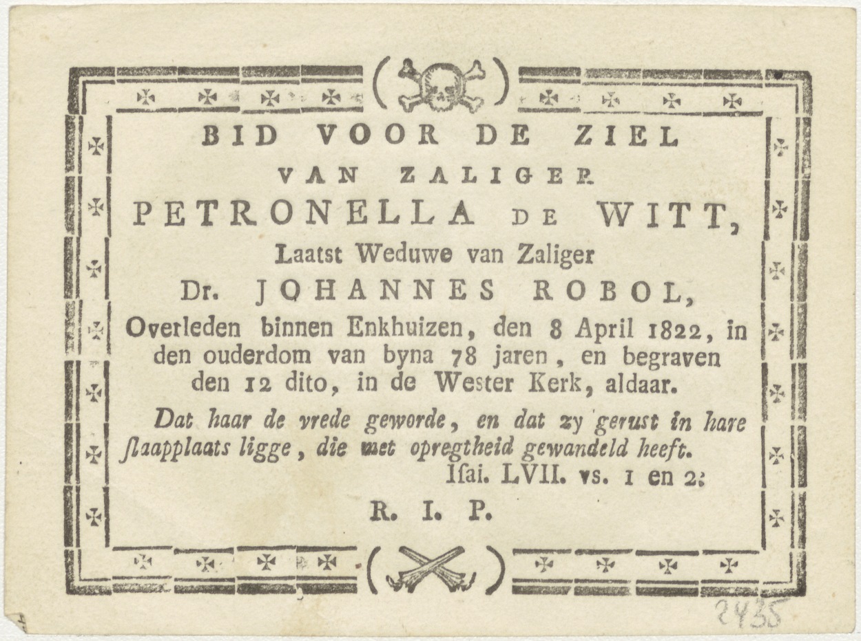 Johannes met lam, kz. Bid voor ziel Petronella de Witt (+1822), Enkhuizen, weduwe van Johannes Robol