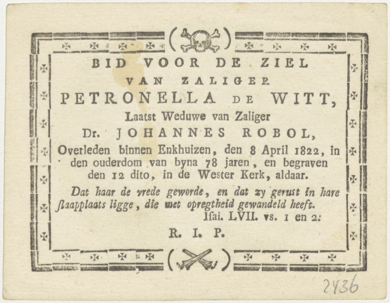 Johannes met lam, kz. Bid voor ziel Petronella de Witt (+1822), Enkhuizen, weduwe van Johannes Robol