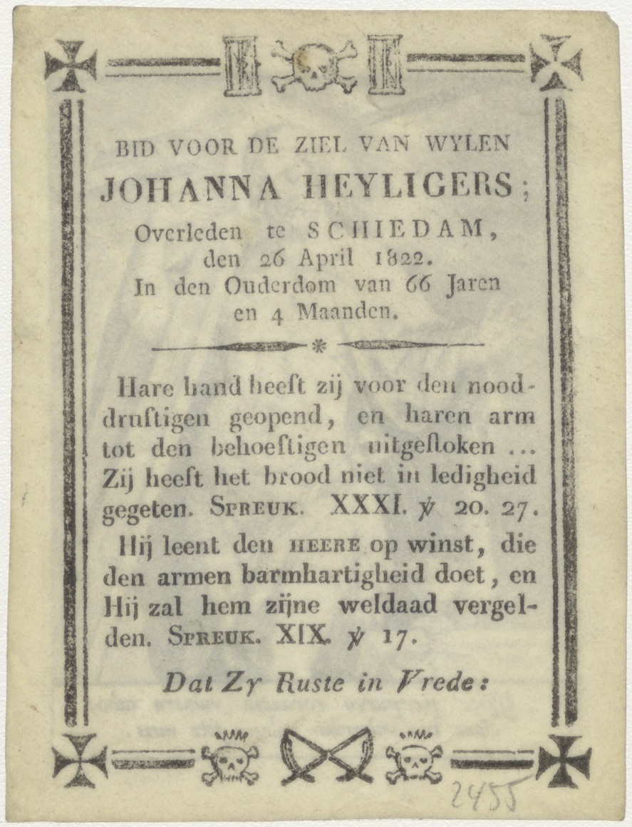 Christus met kruis, bloed vloeit in kelk, kz. Bid voor ziel Johanna Heyligers (+1822), Schiedam
