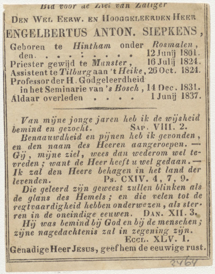 Vanitas schedel, kz. religieus, Engelbertus Siepkens (+1837) Den Bosch