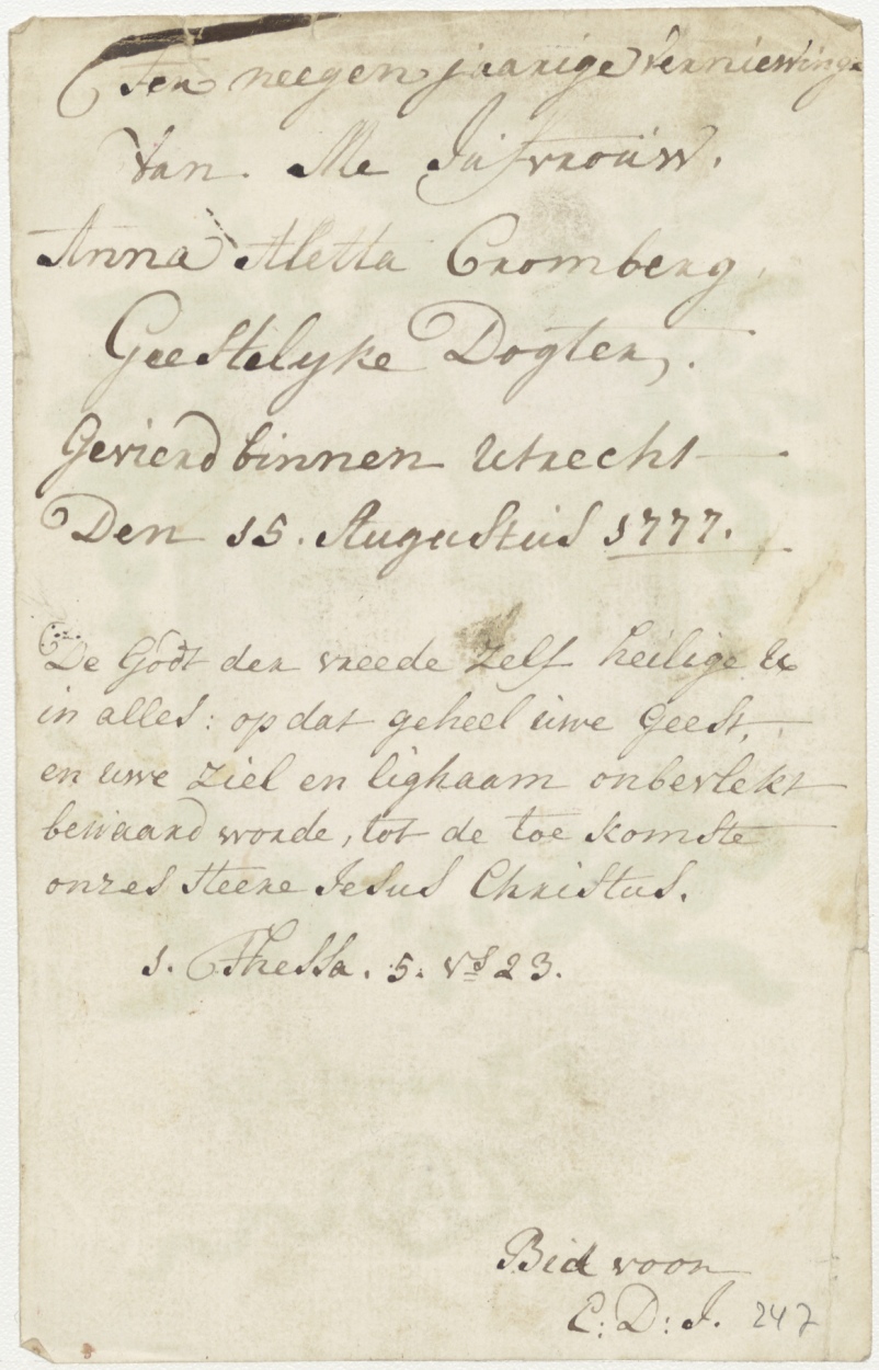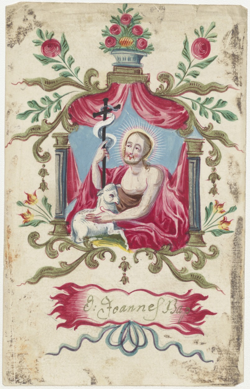 H. Joannes (Johannes) Baptista, ingekleurd, kz. Religieus; negen jaar geestelijk dogter; Anna Aletta Cromberg; Utrecht; 1777; gebed;