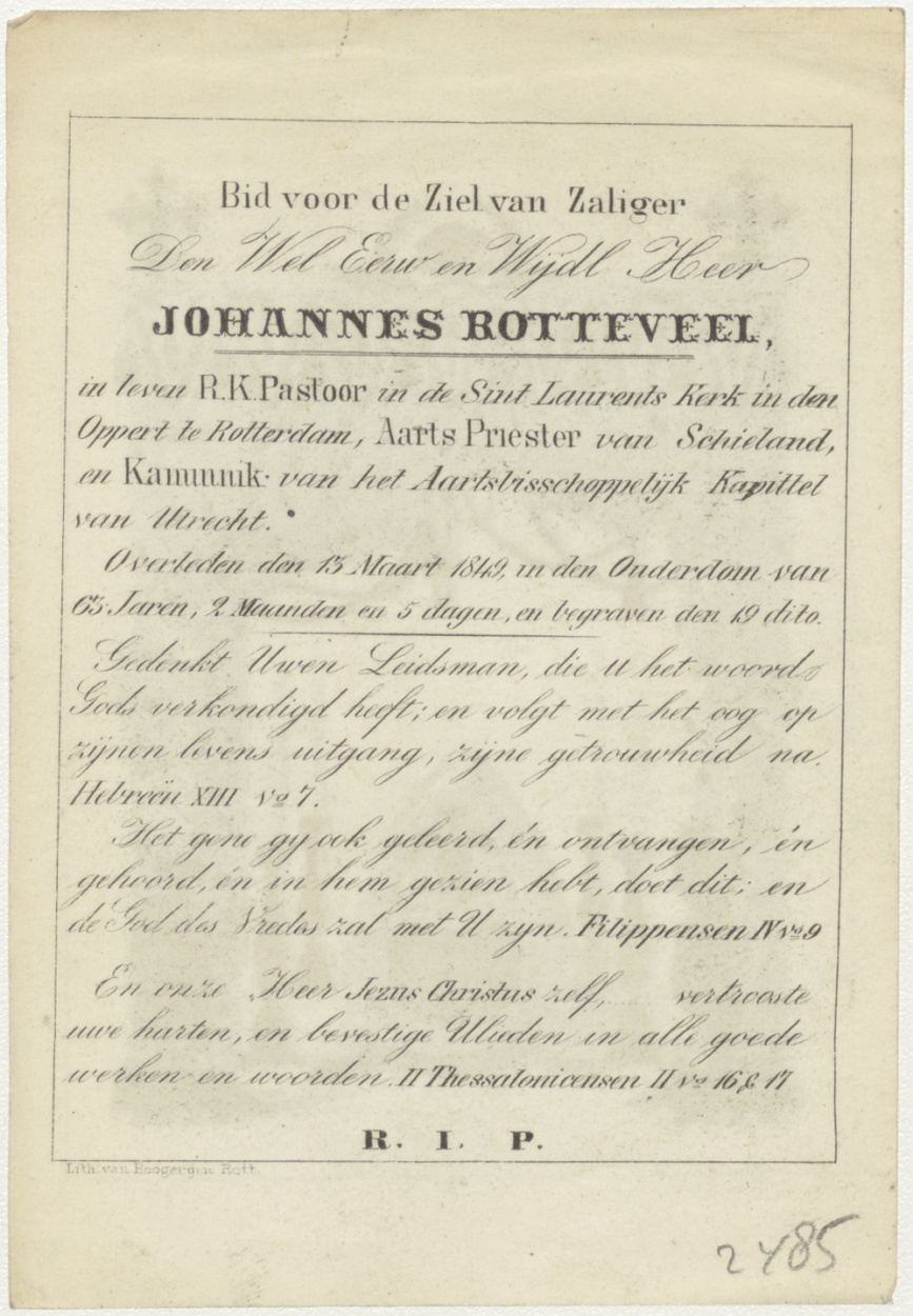 Doodskist van baldakijn, kz. religieus; Rotteneel(+1849) pastoor Laurentskerk in den oppert Rotterdam