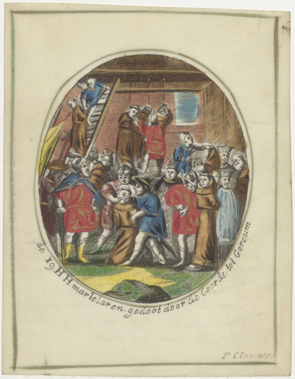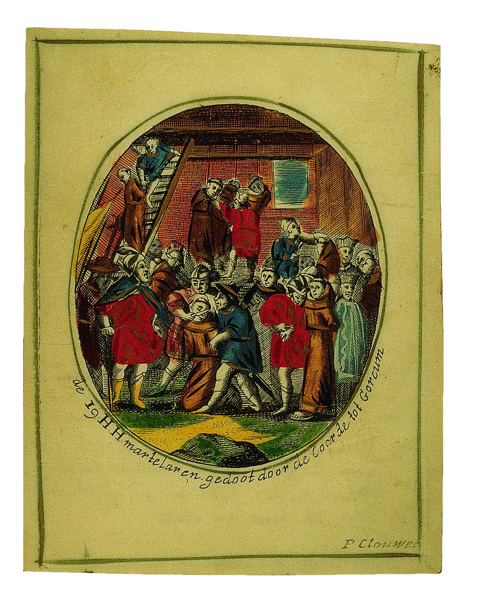 19 H.H. martelaren gedoot door de Coerde tot Gorcum, ingekleurd, kz. Religieus;Bid voor ziel Adriaentie Tijse (+1684)