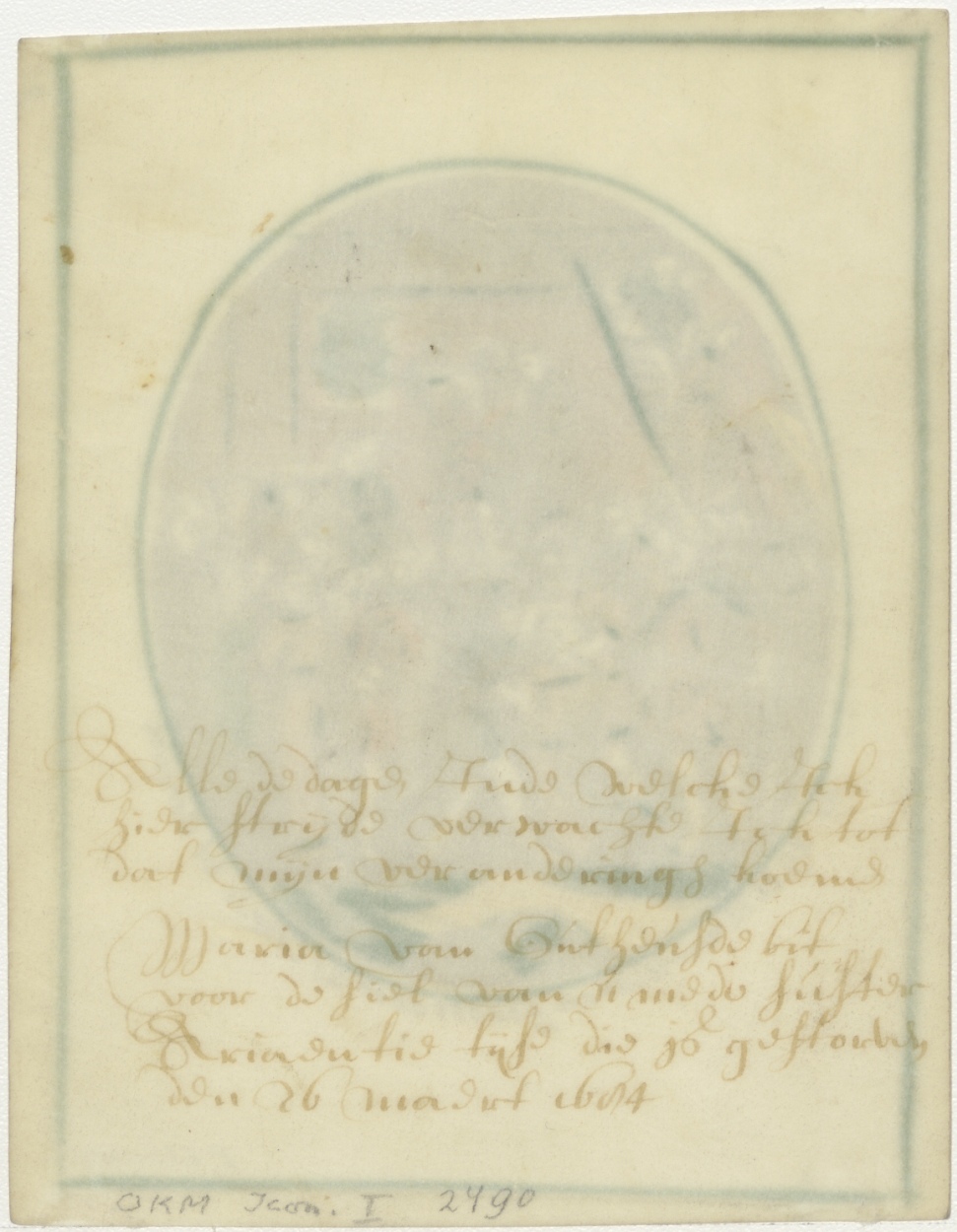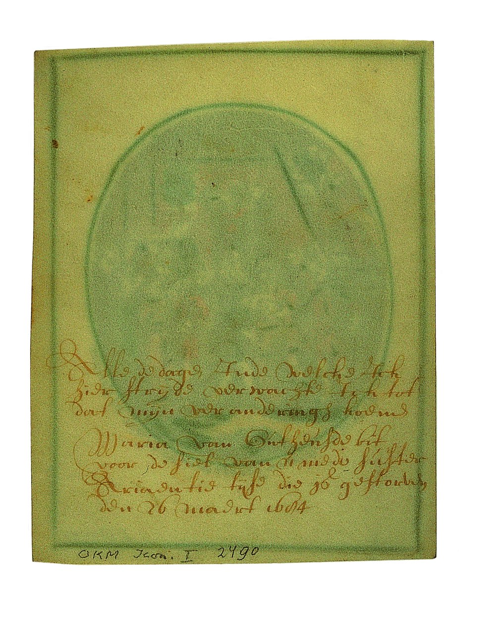 Op keerzijde de tekst: Alle de dage, in de welcke ick hier strijde verwachte ick tot dat mijn veranderingh koeme Maria van Outheusde bit voor de siel van u mede suster Adriaentie Tijse die is gestorven den 26 maert 1684