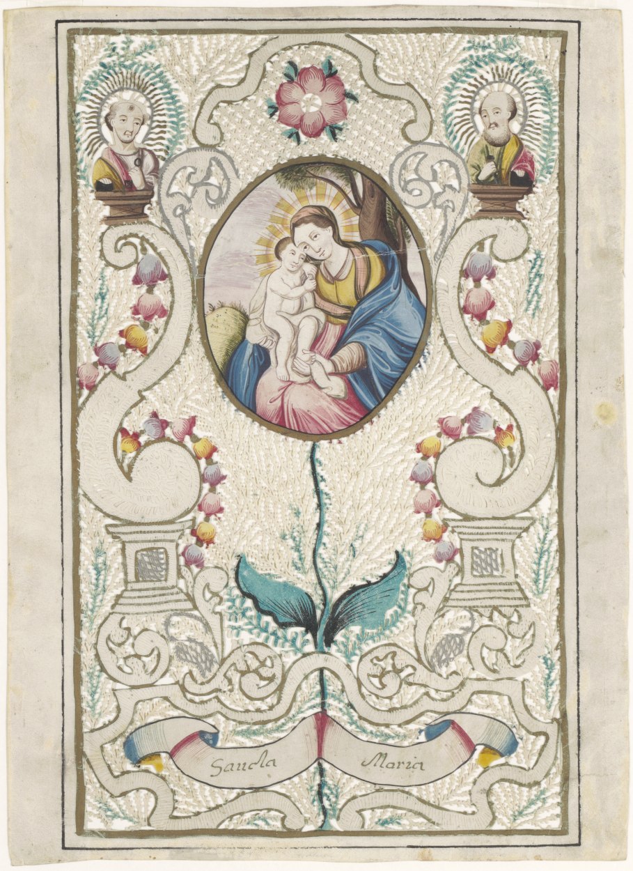 Sancta Maria, Maria met kind, links St. Petrus, rechts St. Paulus, ingekleurd, kz. Tekst "Theodorus Johannes van Everdingen heeft deze Prent ten geschenke gekregen van zijnen Heer Oom, den Zeer Eerwaarden Heer T.J. van Everdingen in dien tijd Oud R.K. Pastoor te Gouda (genaamd de Tol) in den Jare 1800 vijf en twintig"