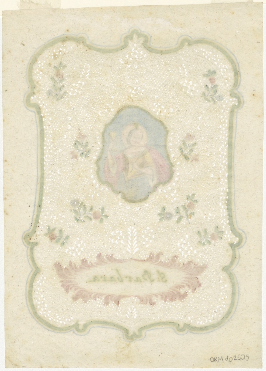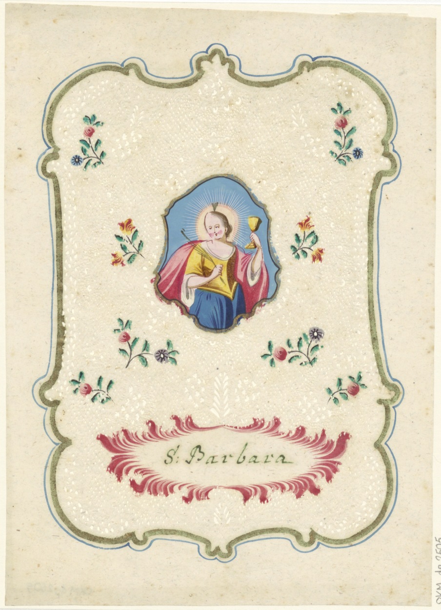 H. Barbara met kelk in linkerhand en palmtak in rechterhand, ingekleurd
