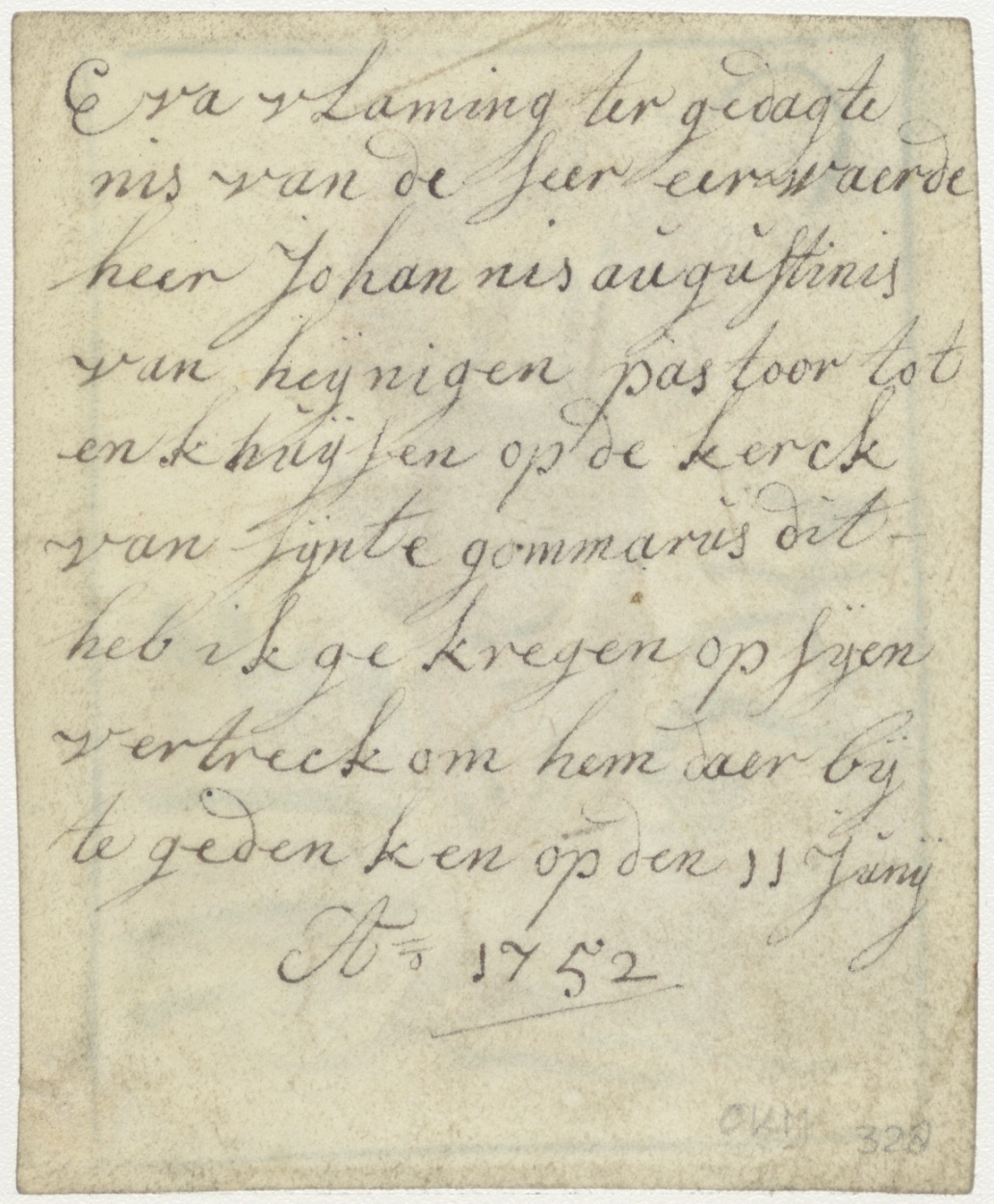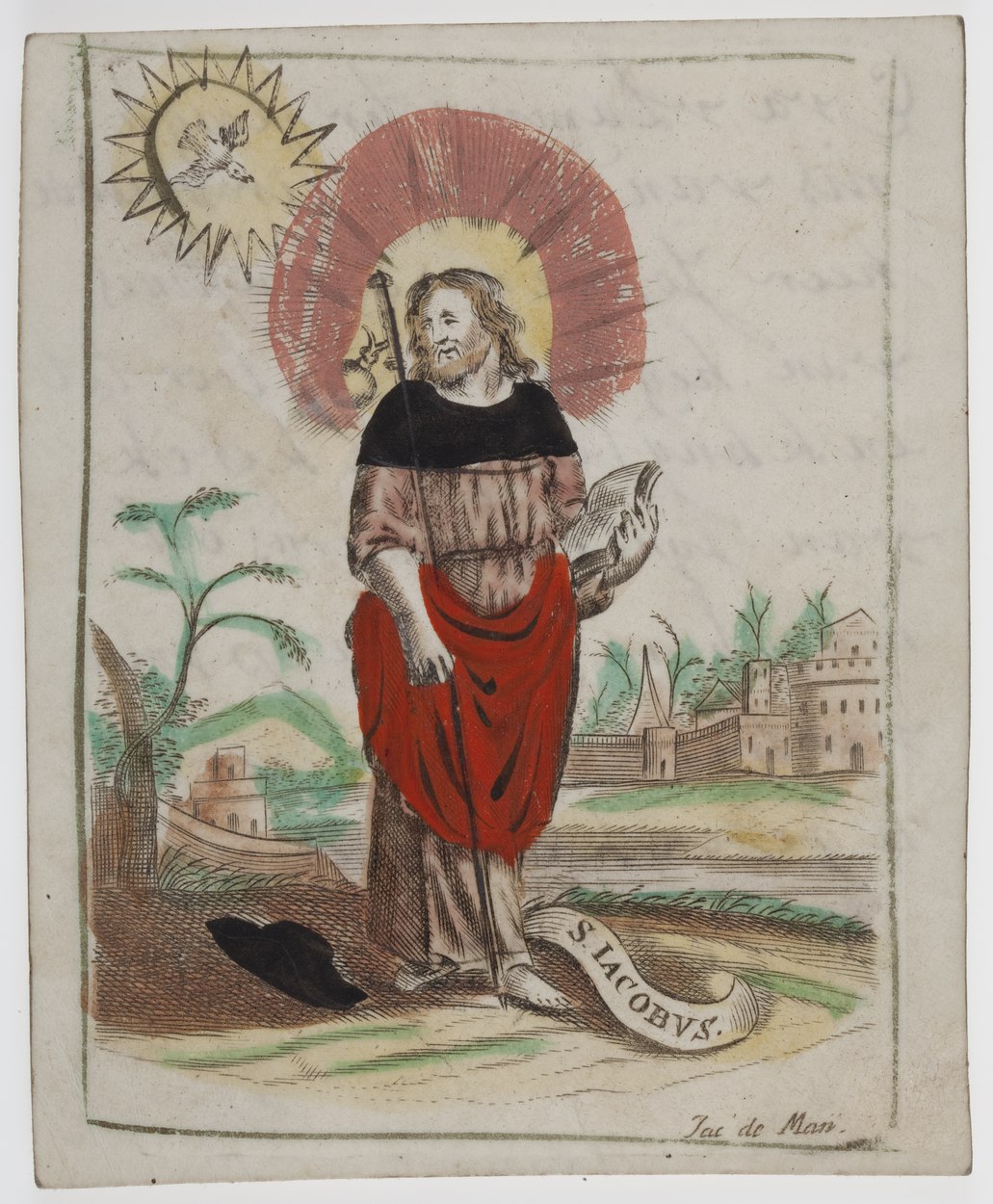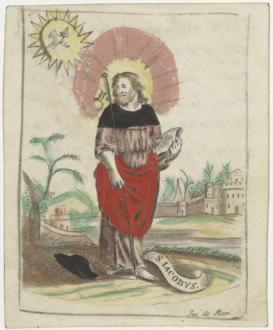 H. Jacobus als pelgrim, ingekleurd, kz. aan Eva Vlaming bij vertrek van pastoor Johannes Augustinus van Heijnigen, 1752