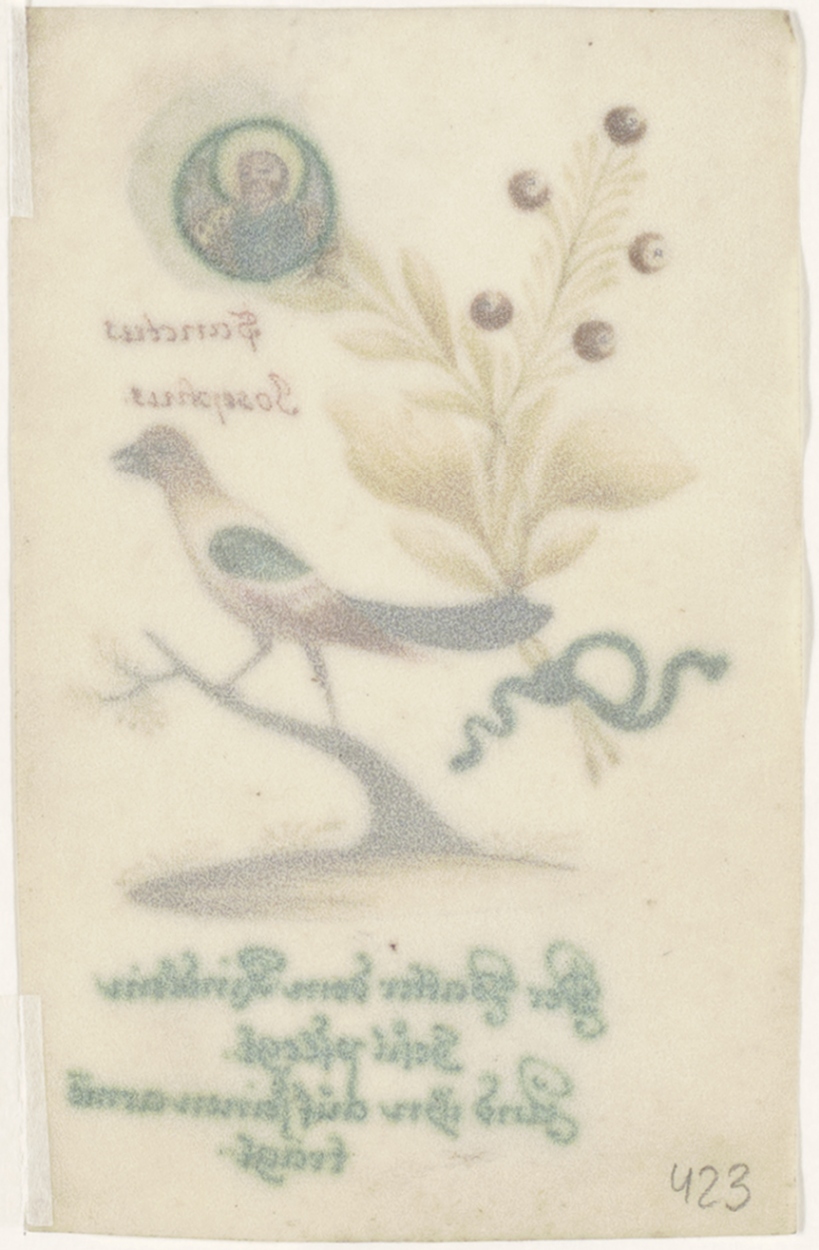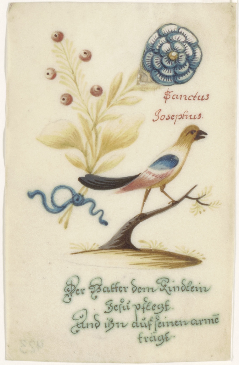 H. Josephus (Jozef), vogel met bloem waaronder heilige (Duits), ingekleurd