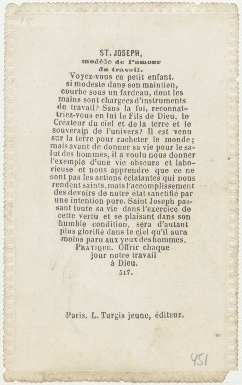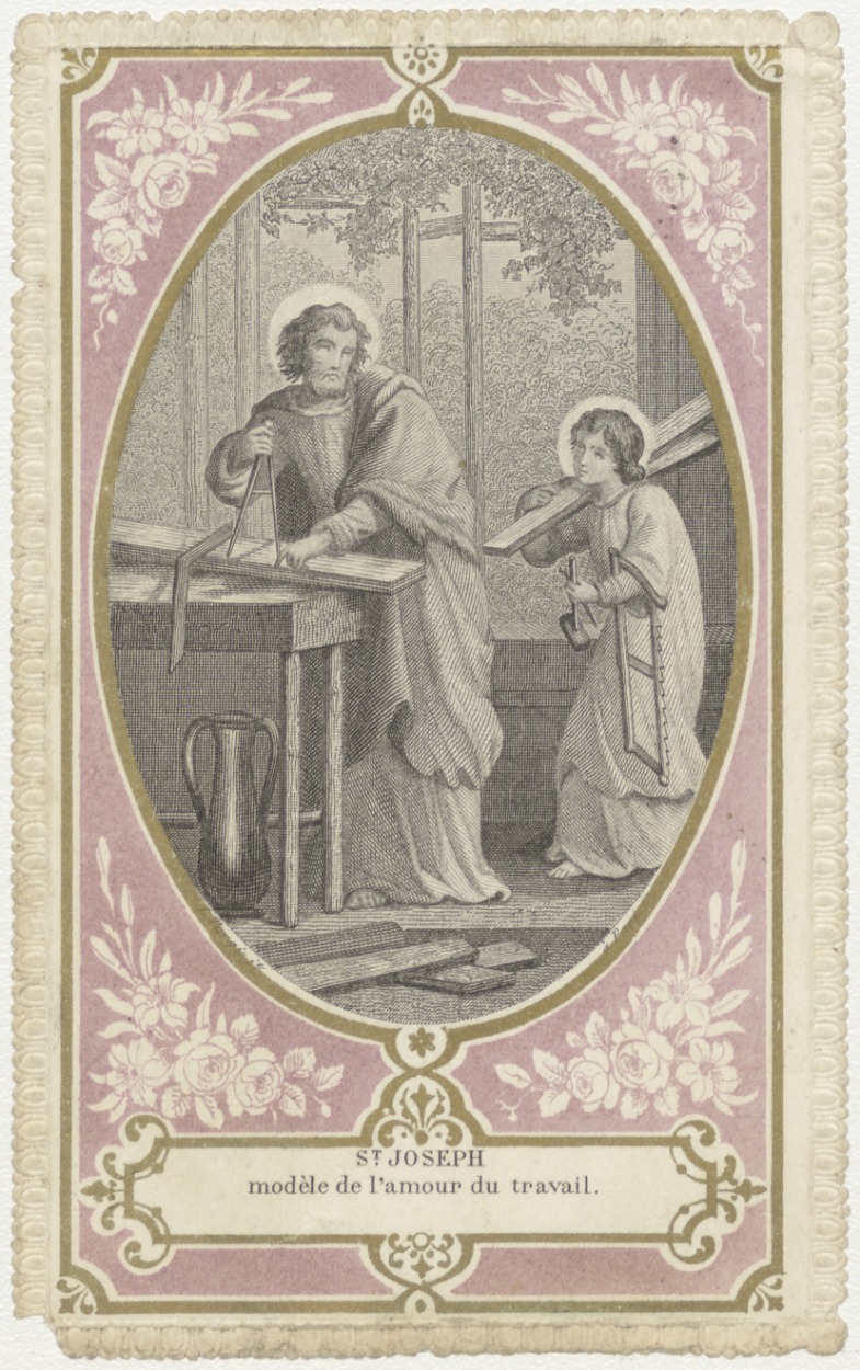 H. Joseph (Jozef), met Christuskind, timmermanswerkplaatsscène (Frans), kz. gebed (Frans);