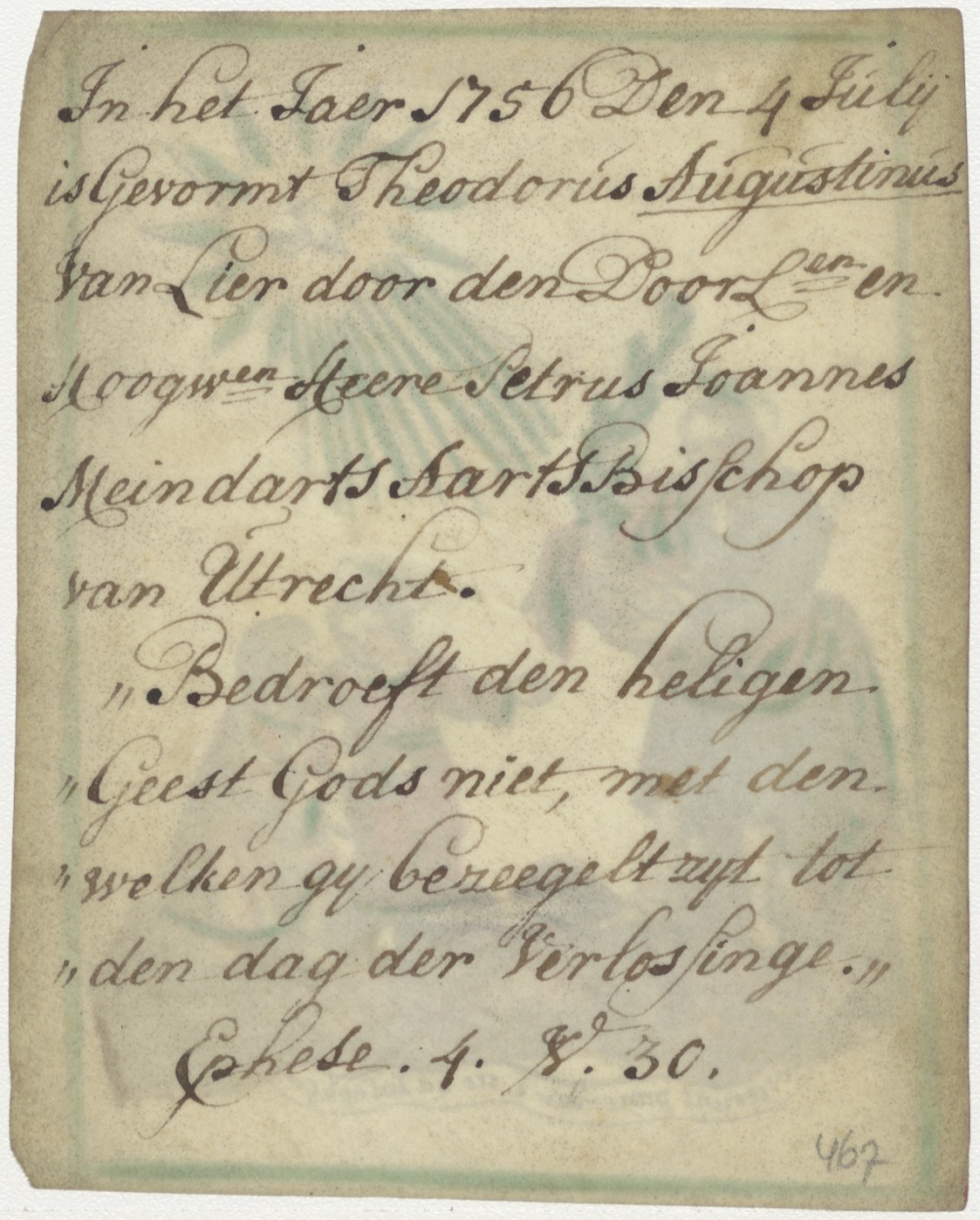 H. Joseph (Jozef), ingekleurd, kz. vormsel Theodorus Augustinus van Lier (1756) door Petrus Joannes Meindarts, aartsbisschop van Utrecht