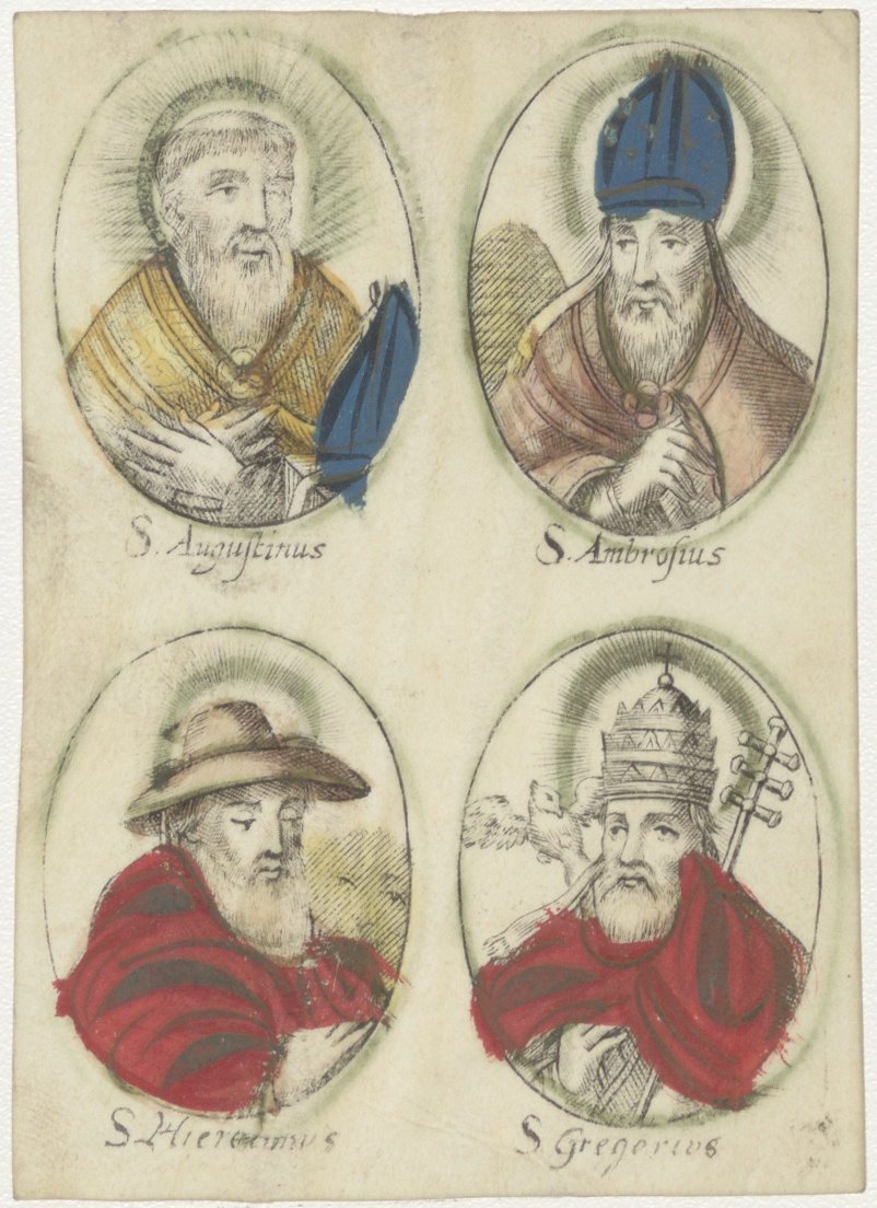 Vier kerkvaders: H. Augustinus, H. Ambrosius, H. Hieronimus, H. Gregorius, ingekleurd
