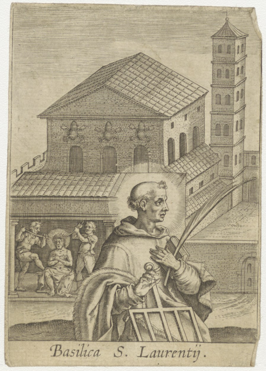 H. Laurentius, met kerk en martelscène Christus, Basilica S. Laurentij (Italiaans)
