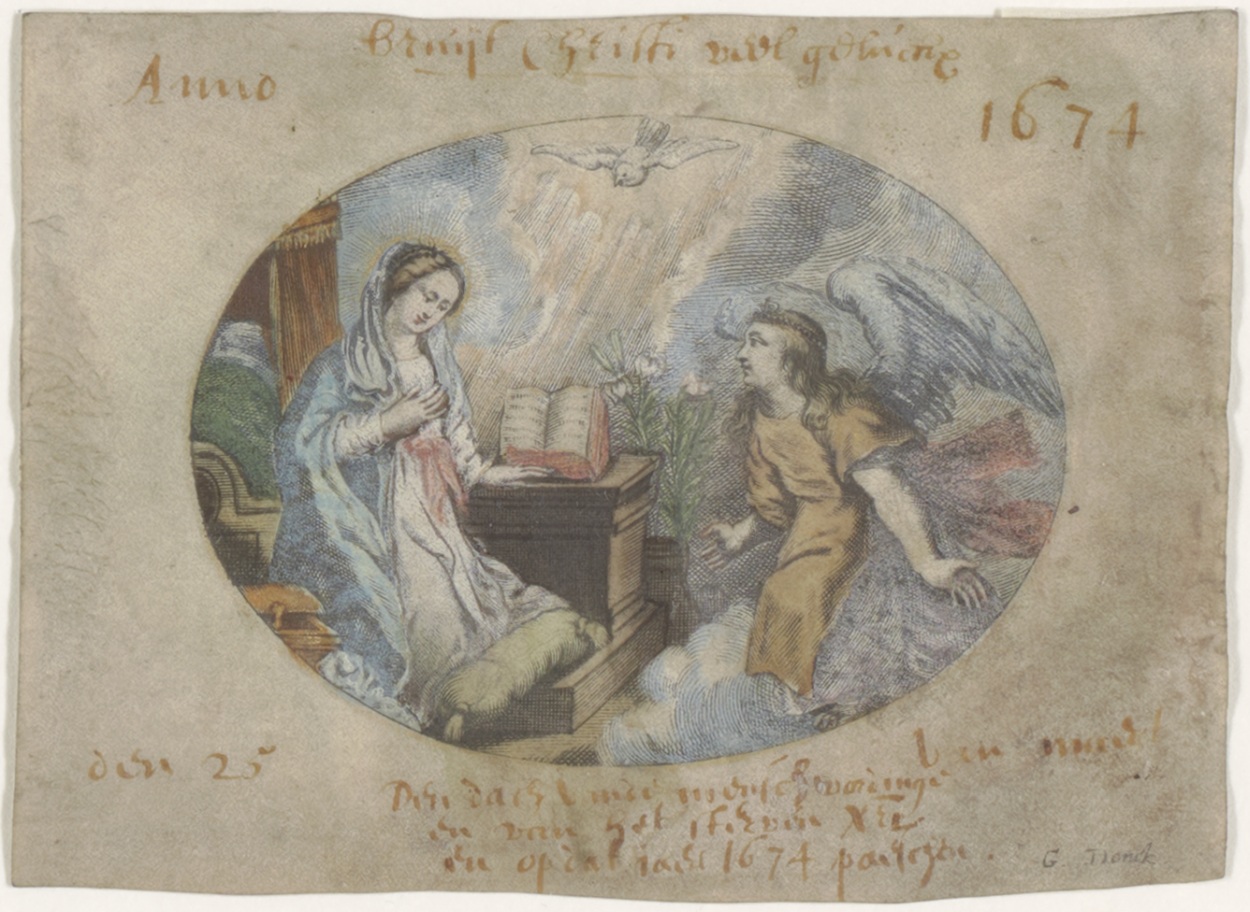 Annunciatie, Maria boodschap, ingekleurd, met Anno 1674 bruijt Christi ..., kz. ... bidt voor Annetje Jacobs ...