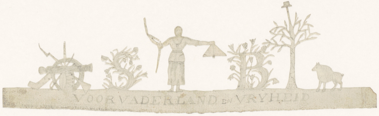 Profaan knipsel met o.a. gevechtswapens, versierde S, mensfiguur, versierde B, boom met hoed in top en dier, eronder met "voor vaderland en vrijheid"