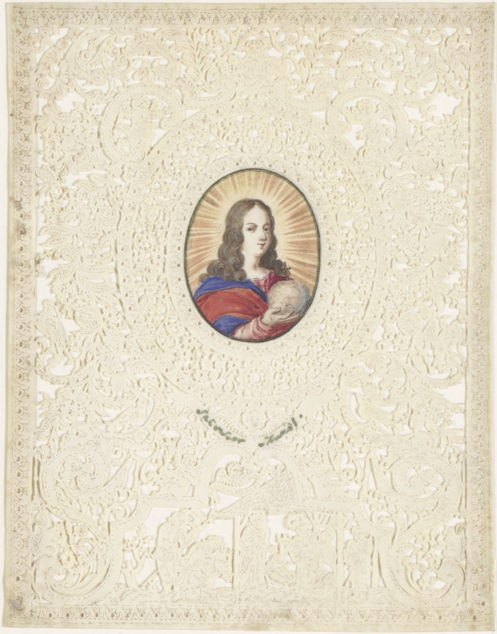 Christus als jongeling met wereldbol; geknipte aanbidding der herders, ingekleurd