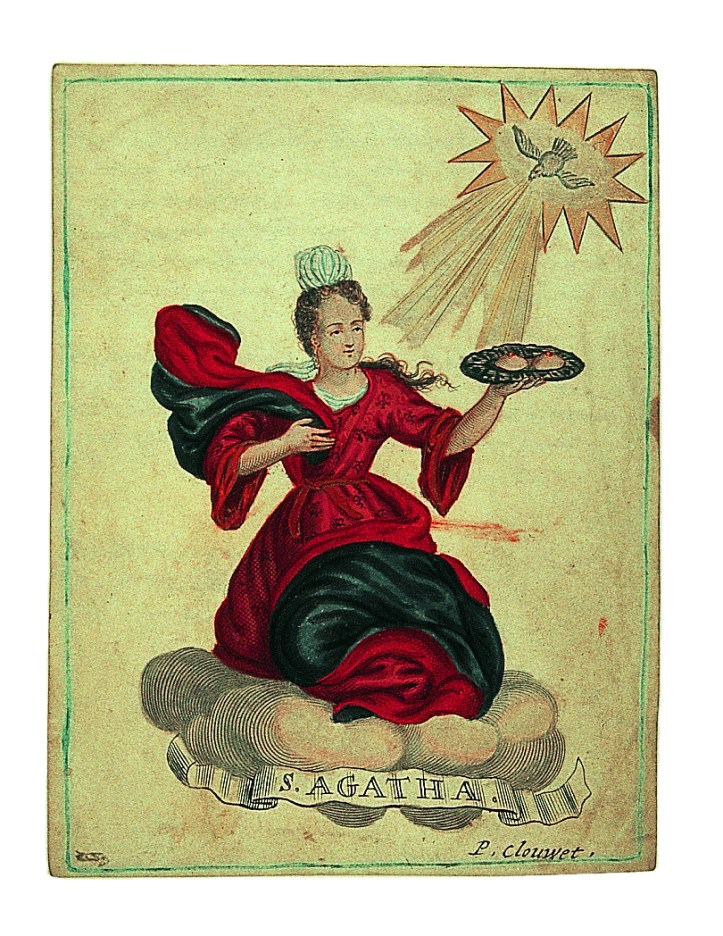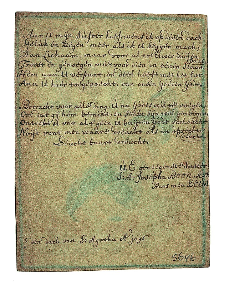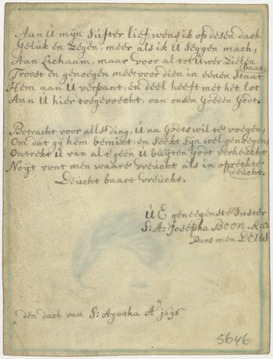 Op keerzijde de tekst: Aan U mijn suster lief, wens ik op desen dach Geluk en zegen, meer als ik u seggen mach, Aan lichaam, maar voor al tot Uwer zielenbaat Troost en genoegen mee, voor dien in eenen staat Hem aan U verpant, en deel heeft met het lot Aan U hier toegevoecht van ...