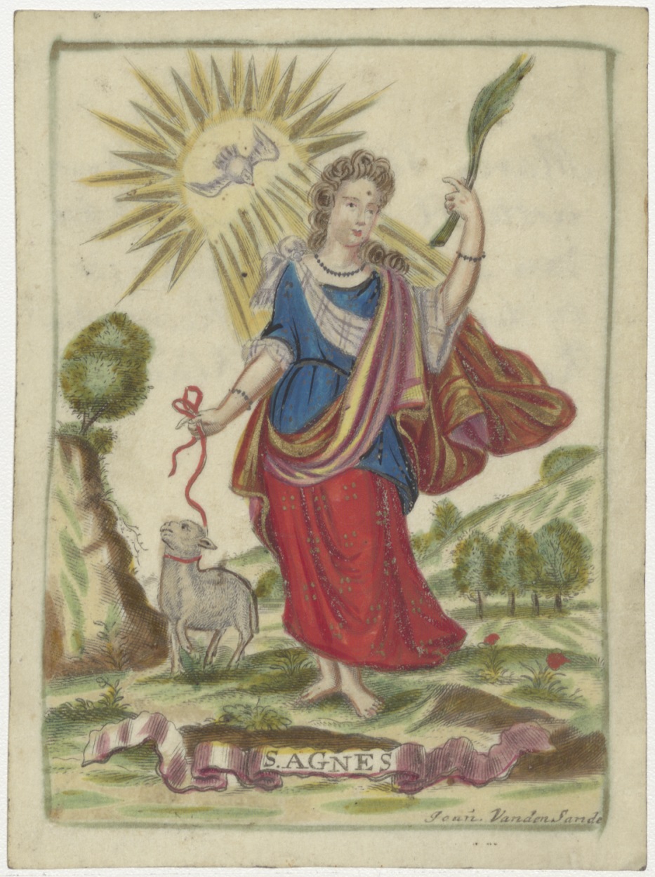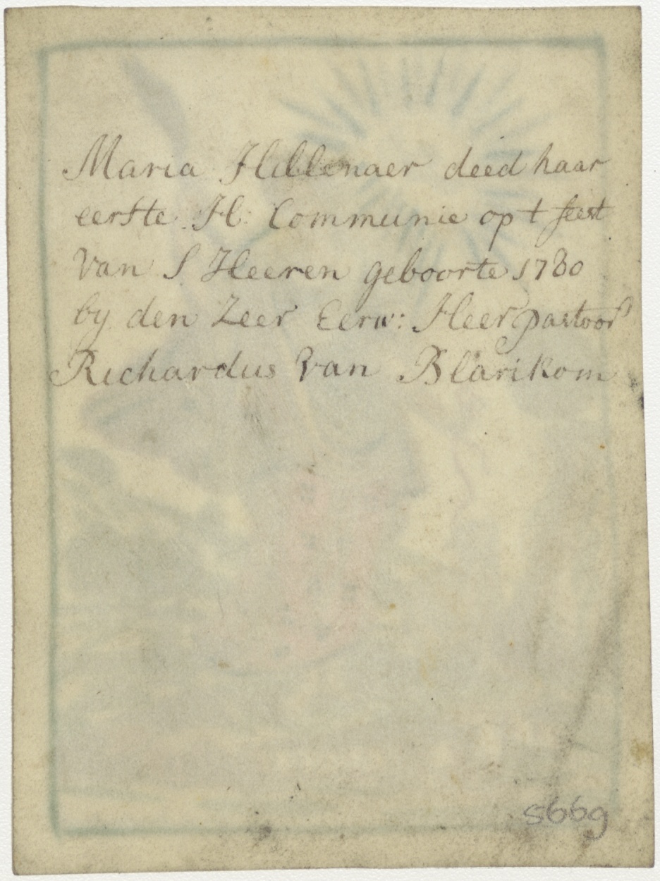 H. Agnes, ingekleurd, kz. H. Communie; Hillenaer door pastoor van Blaricom 1780