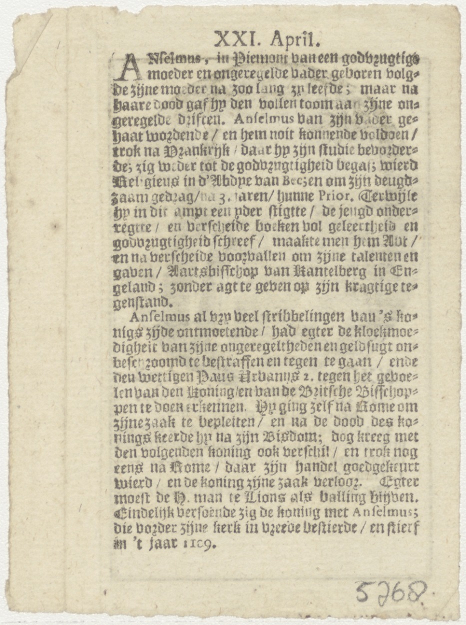 H. Anselmus met levenschrijving, kz. Koddé; levensbeschrijving