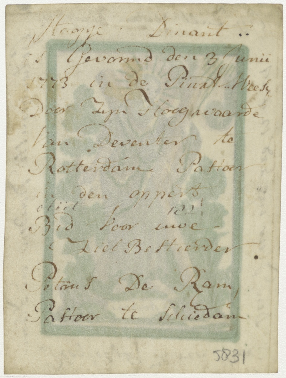 H. Andreas,, ingekleurd, kz. H. Vormsel Aagje Dinant (1773) door pastoor Petrus de Ram, pastoor te Schiedam