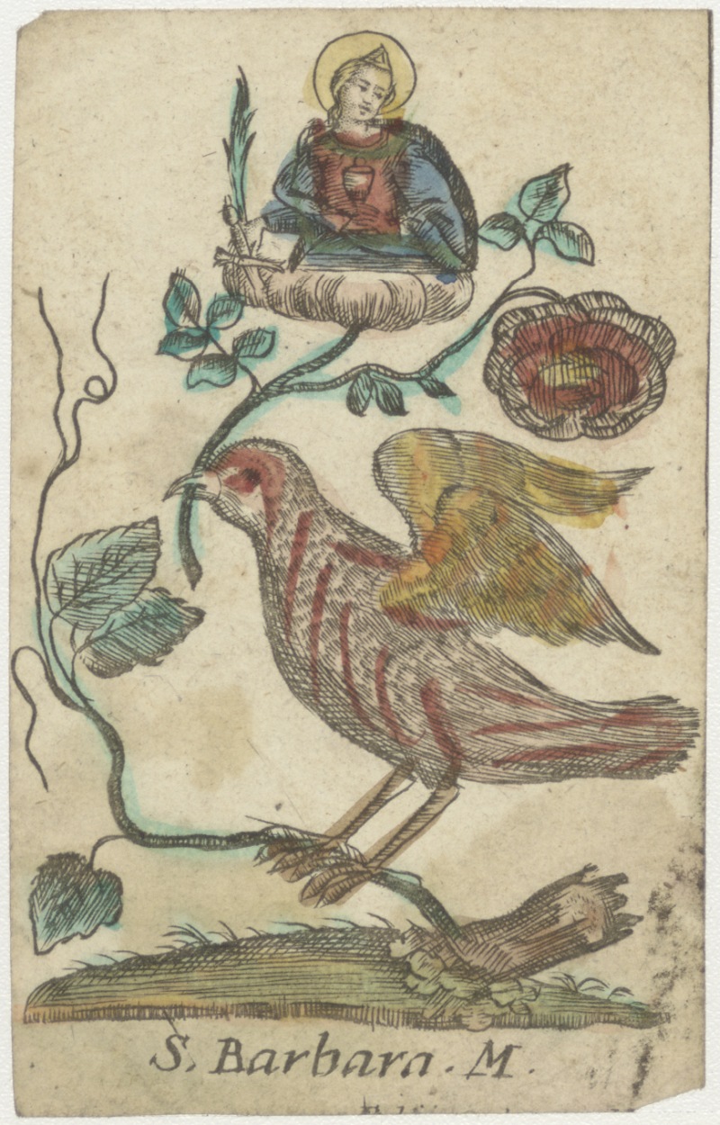 Vogel met tak waarop H. Barbara, ingekleurd