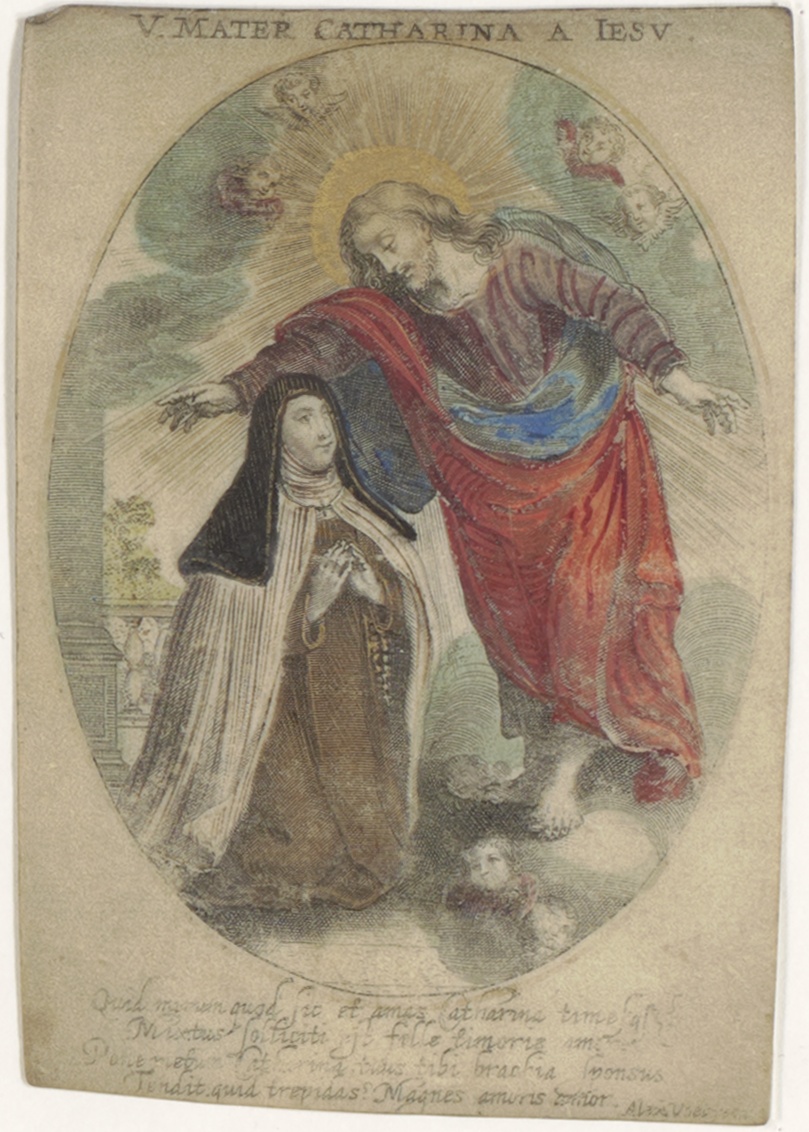 Catharina van Jezus, knielende karmelietes (Catharina Volders(?), 1602-1677) ontmoet Christus in visioen, ingekleurd