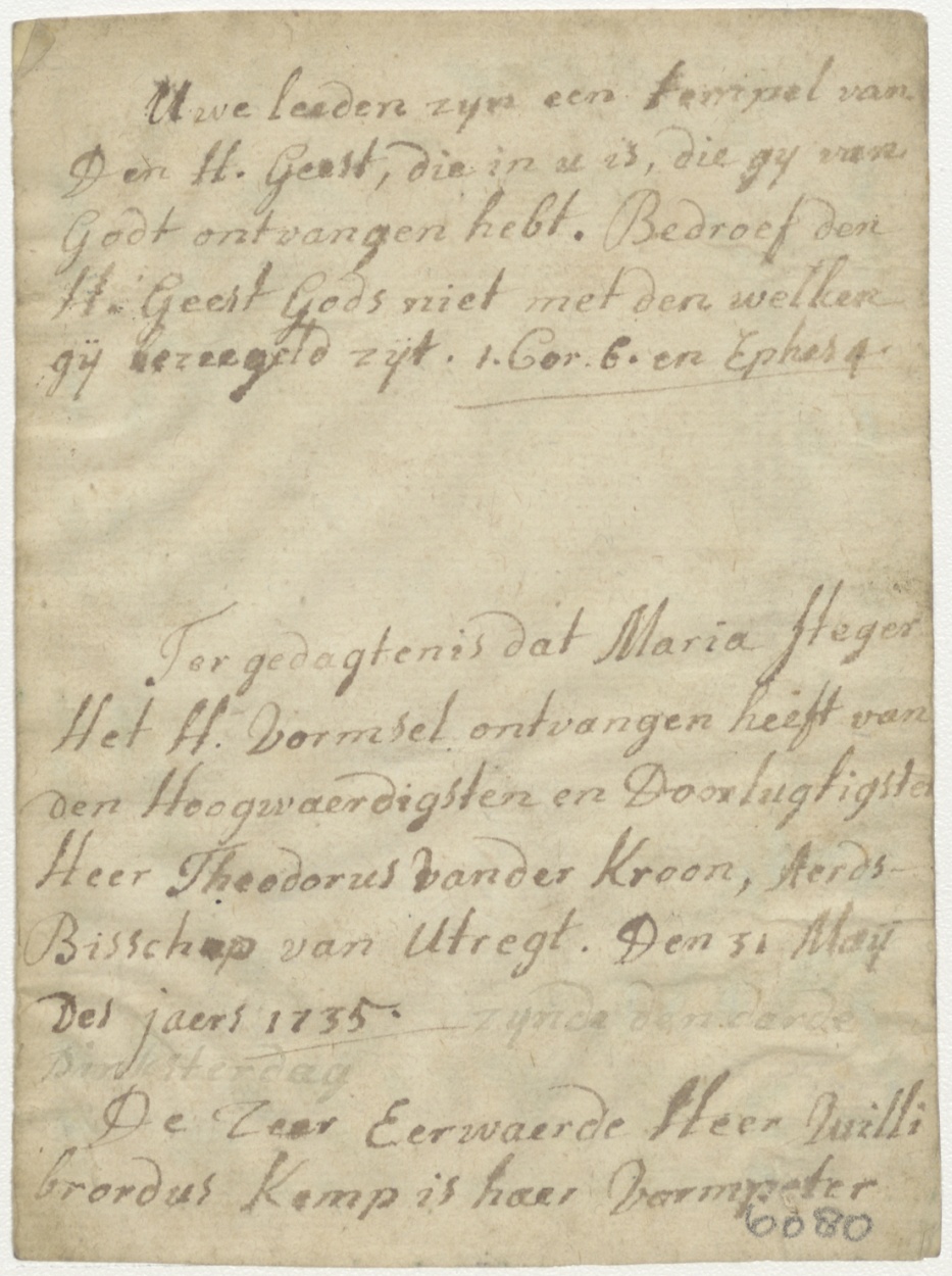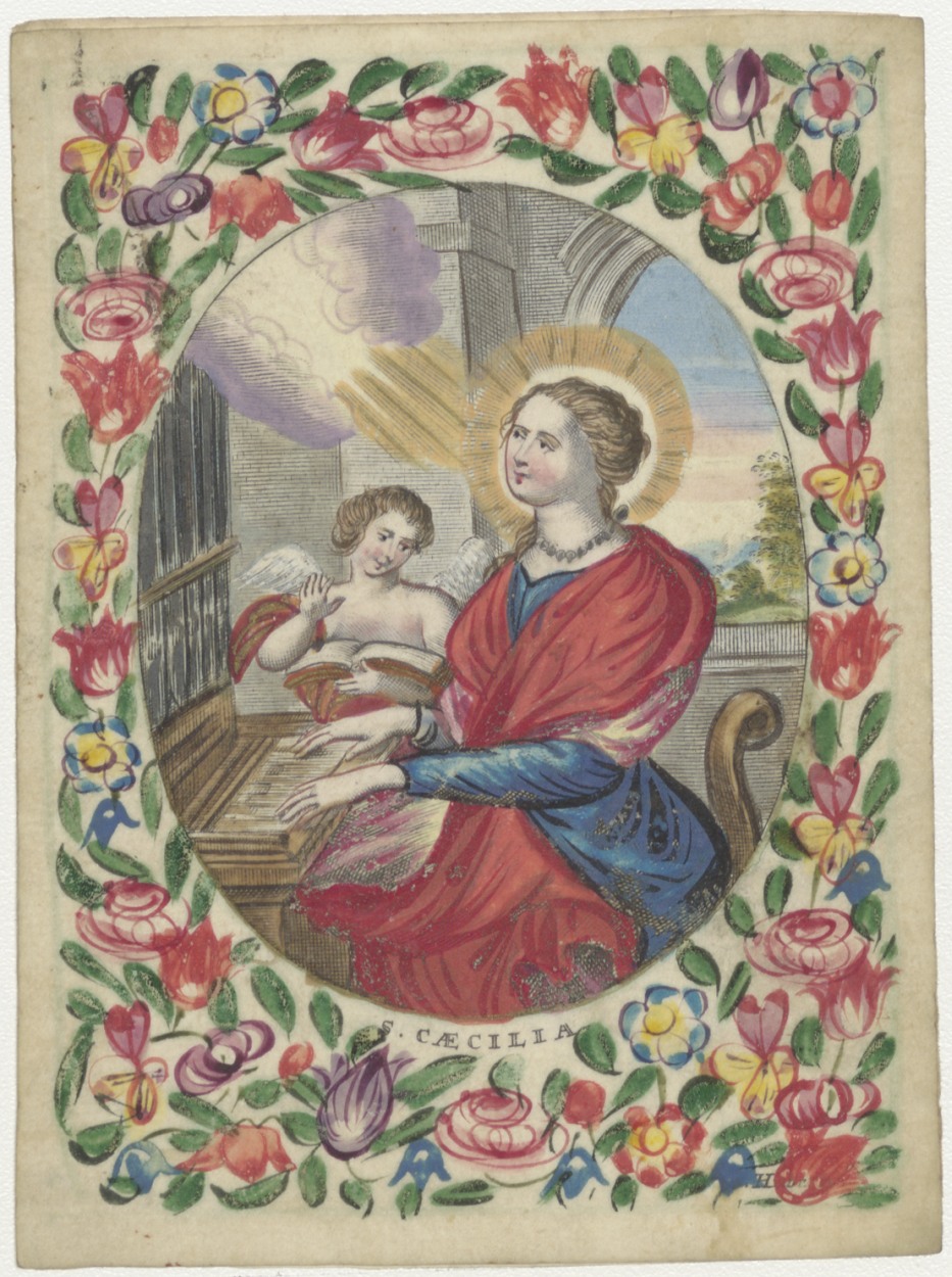 H. Cecilia, ingekleurd, kz. H. Vormsel Maria Steger (1735) door de heer Theodorus van der Kroon, aartsbisschop van Utrecht