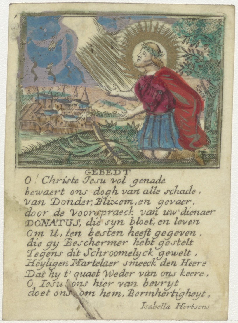 H. Donatus, ingekleurd, met "Ghebedt O! Christe Jesu vol genade bewaert ons dohg van alle schade ...", kz. voila chere Hillena et pensez que je suis votre veritable ami de Swert
