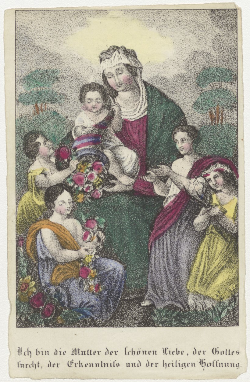 Maria met Christuskind omringd door meisjes, Duits onderschrift