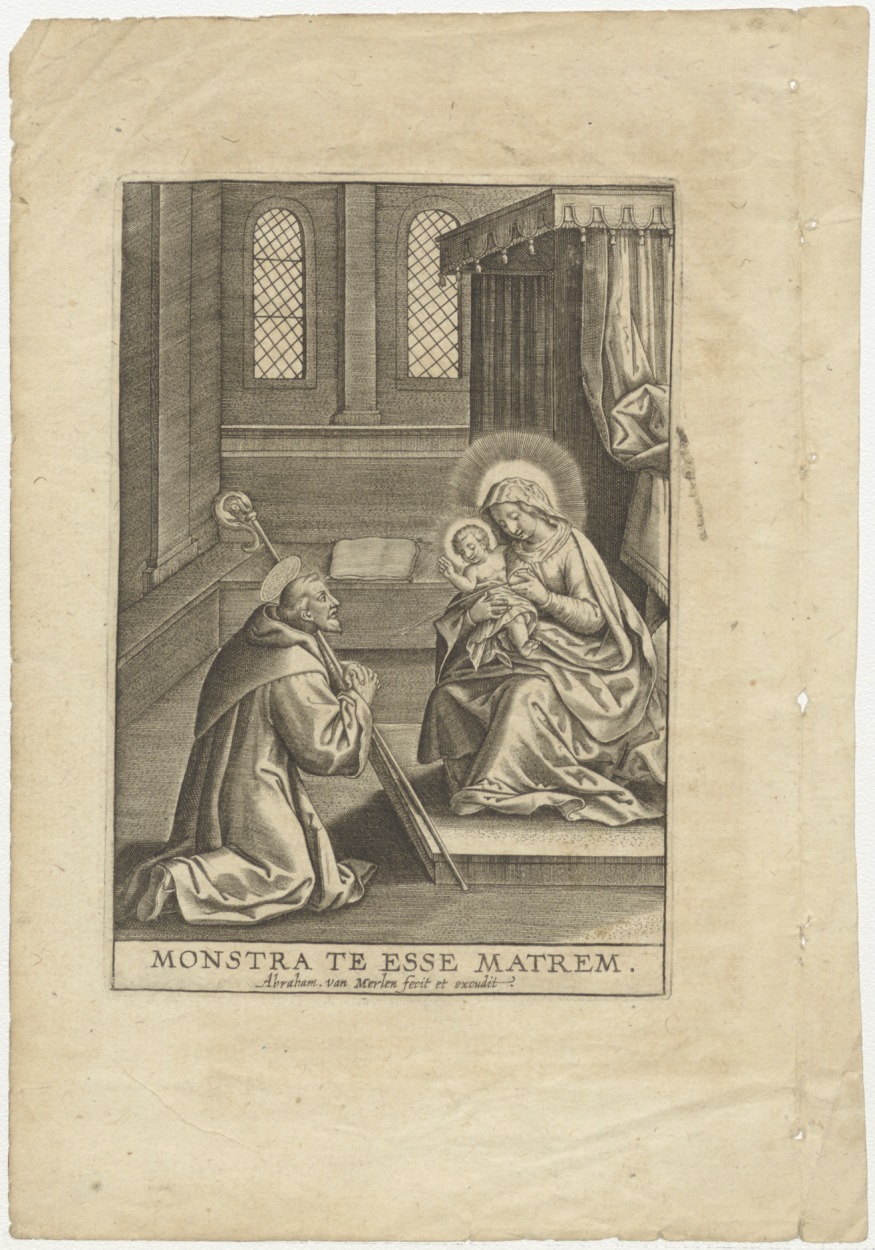 Heilige geknield voor Maria met Christuskind in interieur, uit boek