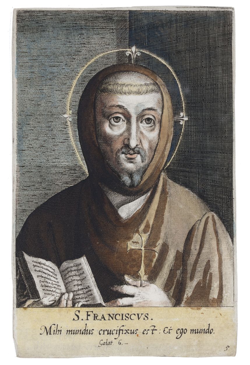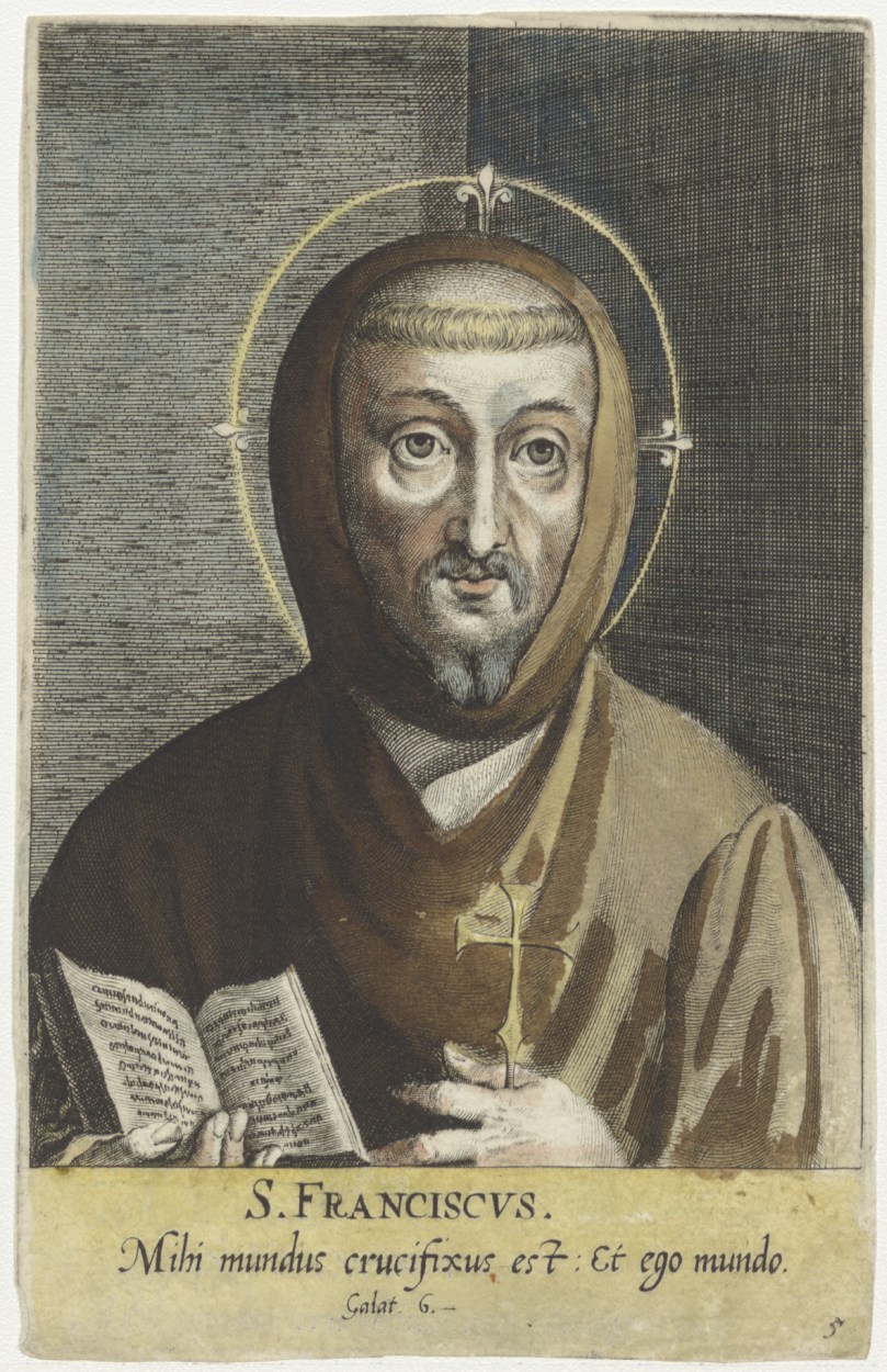 H. Franciscus, ingekleurd, met bijbelcitaat: Mihi mundus crucifixus est : Et ego mundo. / Galat. 6.- (Door het kruis is de wereld voor mij gekruisigd en ik voor de wereld. uit: Brief aan de Galaten 6:14)