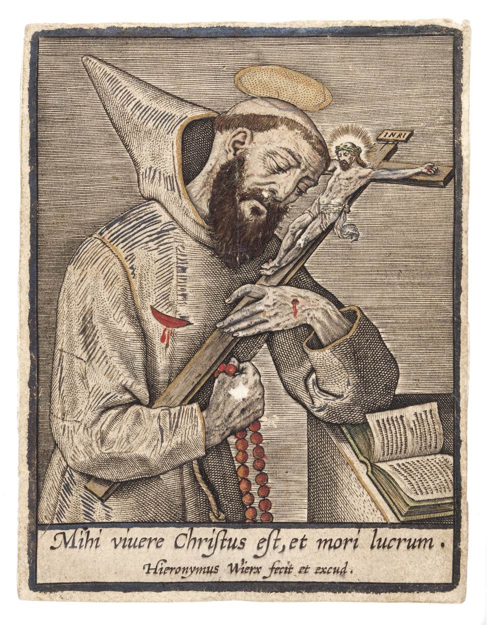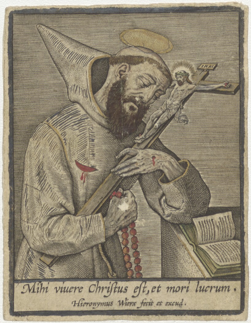 H. Franciscus, ingekleurd, met bijbelcitaat: Mihi vivere Christus est, et mori lucrum. (Voor mij is leven Christus, en sterven winst. uit: Brief aan de Filippenzen 1:21)