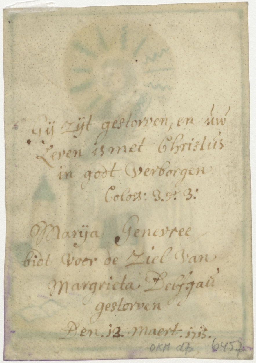 Gorcum, H. Leonardus van Veghel, ingekleurd, kz. Religieus; Marija Genevree bid voor ziel Margrieta Delfgau (+1715)